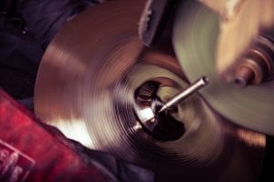 When the cymbal has opted its right thickness it goes to a hydraulic pressing machine where the bell of the cymbal is pressed.