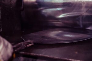 After the “pucks” have cooled just a little they go to the oven and in to the pressing machine. The pressing and oven process is repeated as many time as needed to get the right thickness for the cymbal.