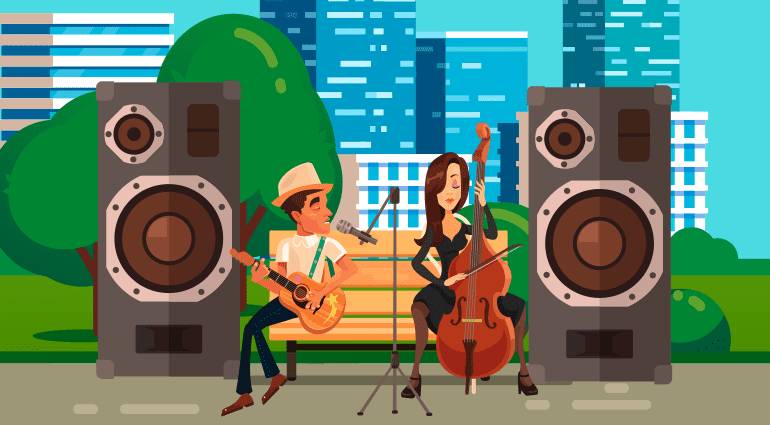Les concerts en plein air posent un réel challenge pour les systèmes de sonorisation. Premier problème: la puissance. En opposition avec les concerts en intérieur, celle-ci doit être bien plus élevée quand il n’y a aucun mur ou paroi pour réfléchir le son. Et, dans le même temps, le système ne doit pas être trop puissant afin d’épargner les crises de nerfs de voisins éventuels ou des passants : la qualité avant le volume. Les musiciens, performers et autres protagonistes peuvent monter une scène facilement (n’oubliez pas les autorisations !) pour leur événement ou festival, en zone piétonne, garden party ou autres, grâce aux systèmes actifs fonctionnant sur batteries, rendant ce type d’événement bien plus simple à mettre en place. Les autres intérêts apportés par ces appareils sont de ne pas avoir autant de câbles, l’installation et le démontage deviennent quasi instantanés et le transport s’en trouve réellement allégé.