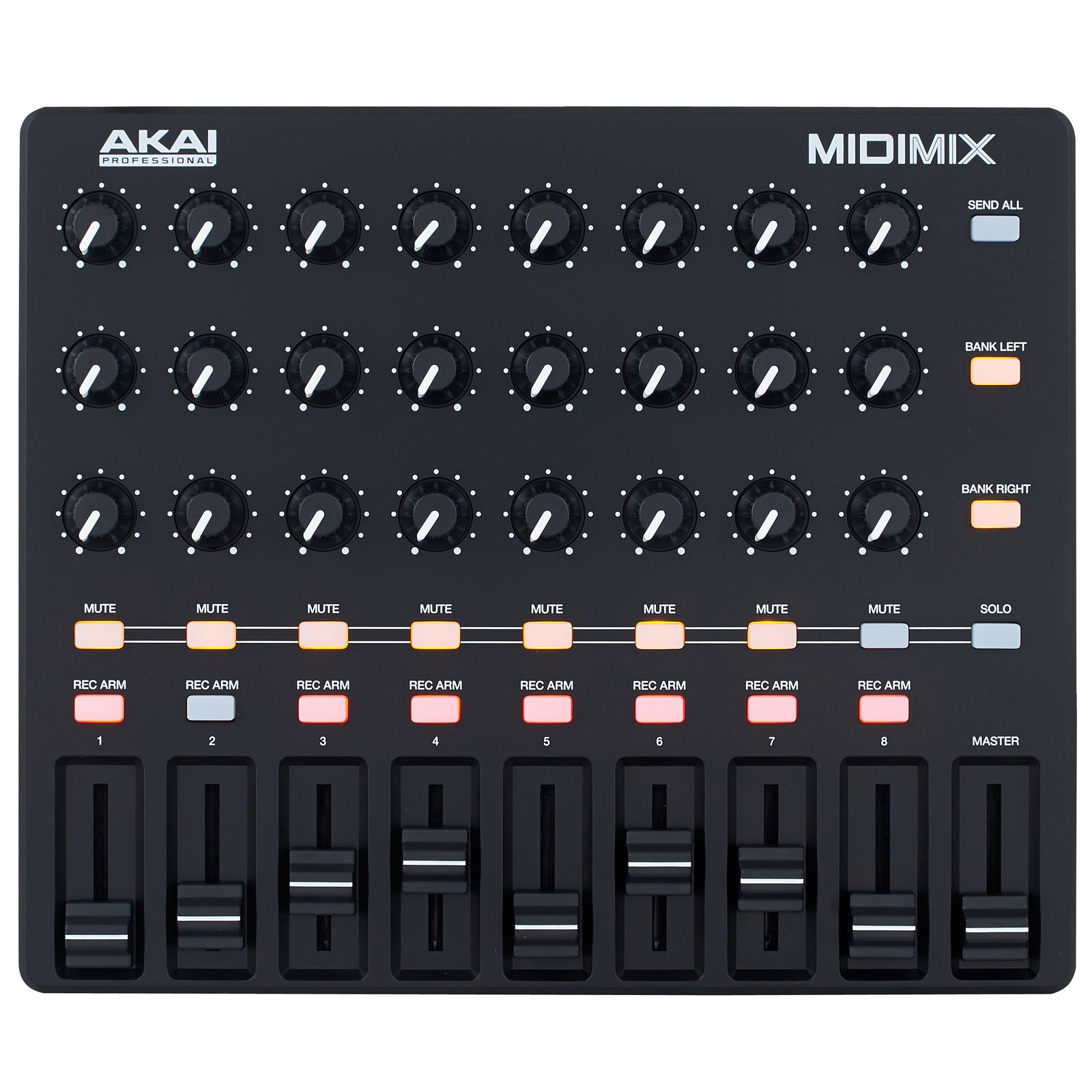 Der MIDImix von Akai Professional ist ein handlicher DAW-Controller, der auf Simplizität ausgelegt ist. Mit ihm lassen sich acht Kanäle steuern, zusätzlich hat man auch Kontrolle über den Masterfader. Pro Kanal gibt es hier drei Drehregler und einen Button, über den zwischen Mute und Solo gewählt werden kann. Obendrein gibt es pro Kanal einen Rec-Arm-Button, der die Aufnahme für den jeweiligen Kanal scharf schaltet. Wer auf der Suche nach einem unkomplizierten MIDI-Controller ist, mit dem die wichtigsten Funktionen der DAW mit nur wenigen Features effektiv gesteuert werden können, wird mit dem MIDImix definitiv fündig.
