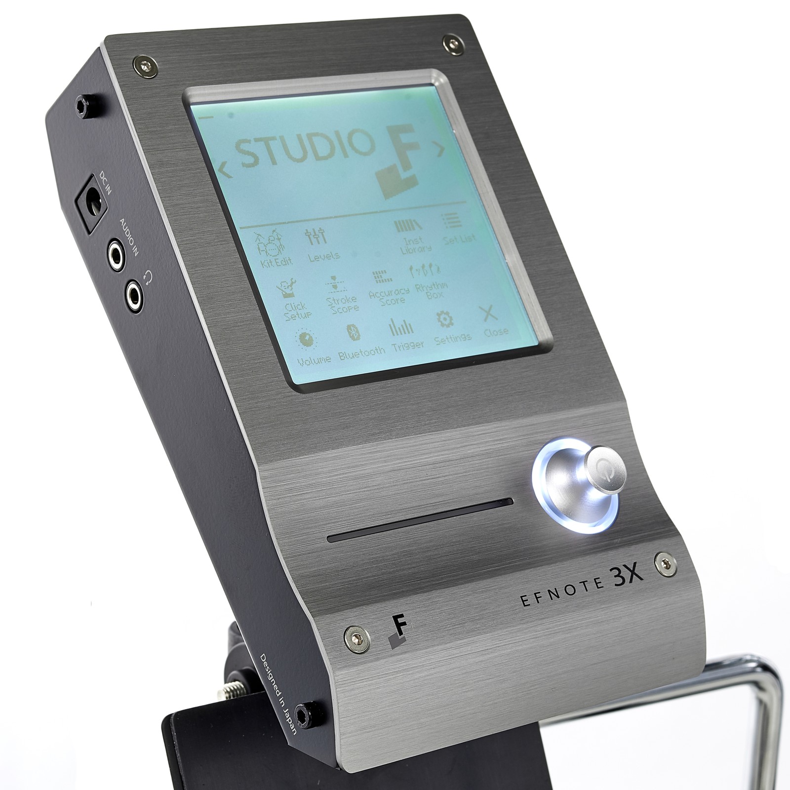 Während viele E-Drum-Hersteller versuchen, sich bezüglich der Anzahl der Modulsounds gegenseitig zu übertreffen, ist beim Efnote 3X Understatement angesagt. 111 erstklassige Sounds, darunter zahlreiche akustische Drum- und Percussionsounds sowie knapp 20 elektronische Klänge, bietet das hochwertig verarbeitete und mit einem Touchscreen ausgestattete Modul – da ist definitiv für jeden Geschmack etwas dabei. Die Sounds können vielfältig bearbeitet und als User Samples auf 50 Speicherplätzen abgelegt werden. Neben 16 Preset Drumkits stehen 34 Speicherplätze für User Kits bereit. Eine Bluetooth-Funktion ermöglicht kabelloses Begleiten der Lieblingssongs auf dem Smartphone, und für Recordingsessions kann das Efnote 3X via USB acht separate Kanäle an den Rechner senden.