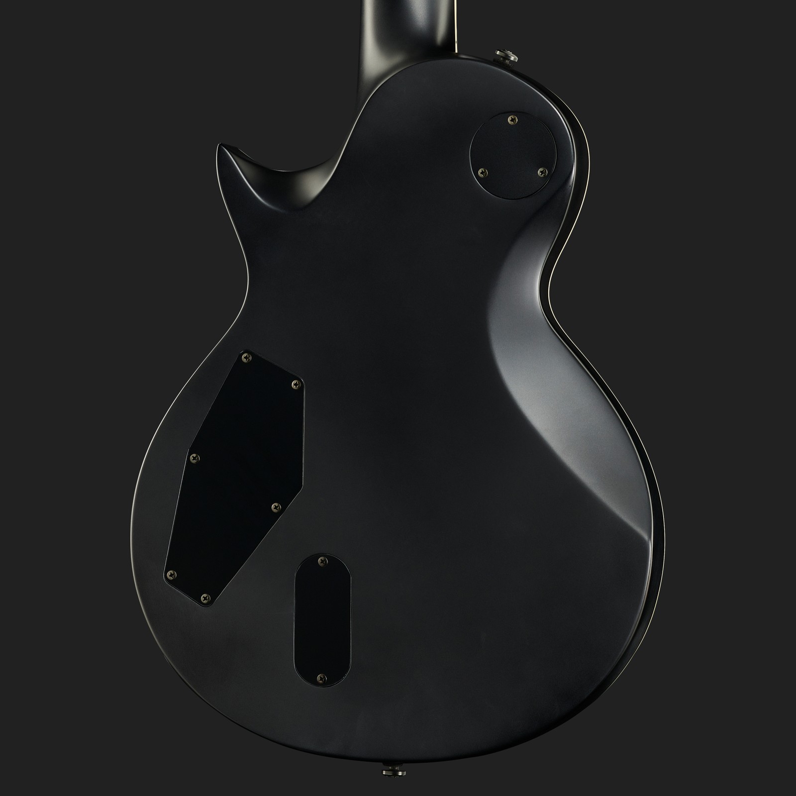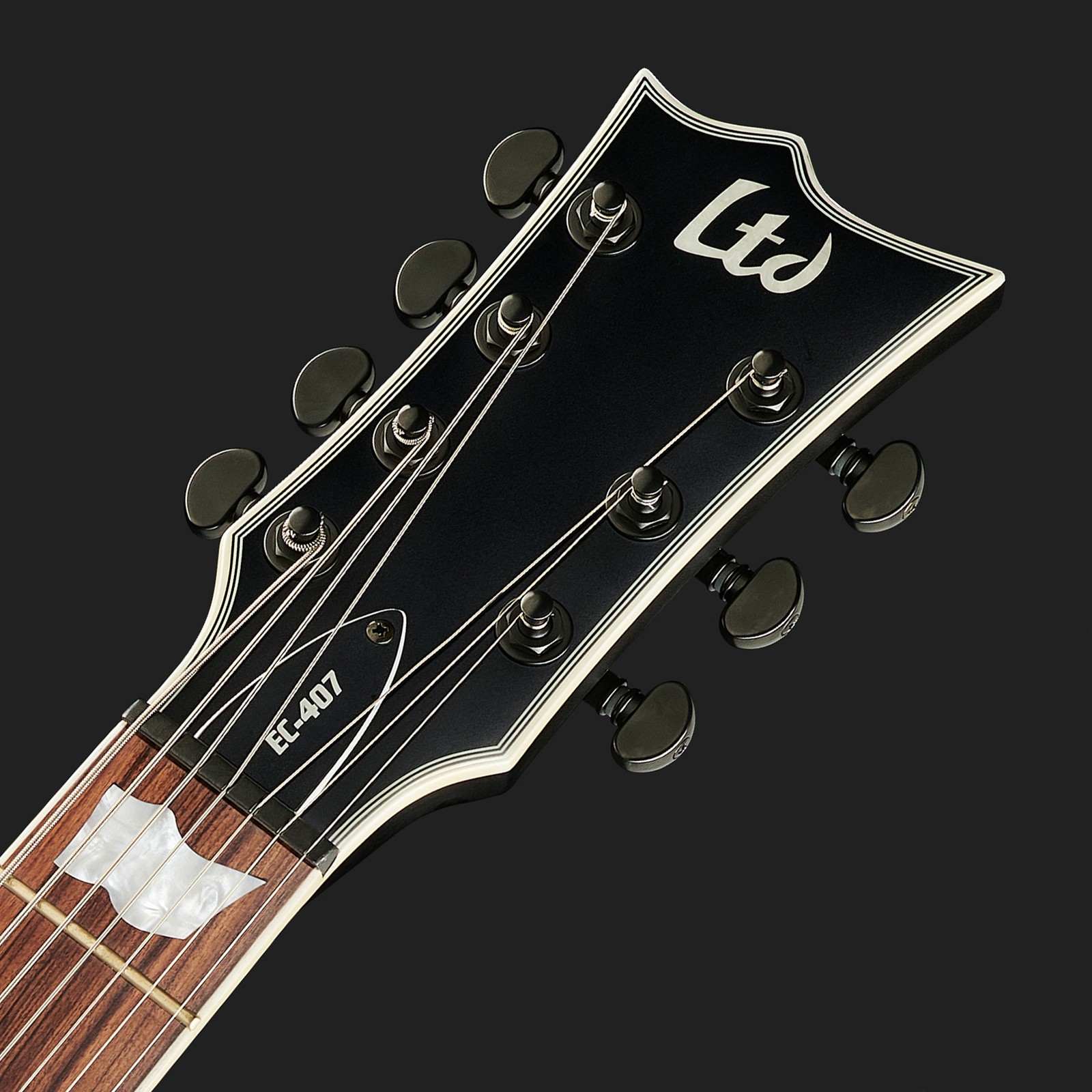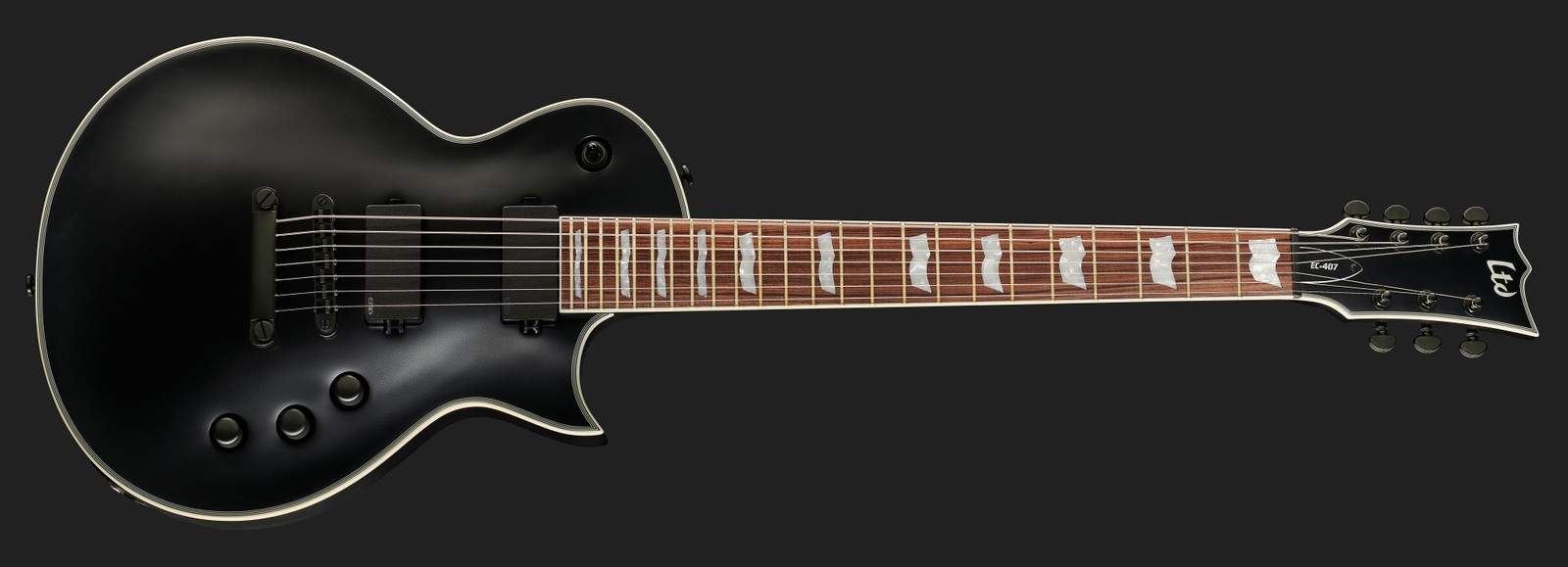 Die Welt der siebensaitigen E-Gitarren ist in den letzten Jahren regelrecht explodiert. Viele Spieler aus dem Metalbereich schätzen daran vor allem den erweiterten Umfang und die Ausdrucksmöglichkeiten, den die tiefe H-Saite bietet. Genau unter diesen Gesichtspunkten wurde die EC-407 Black Satin entwickelt. Sie liefert durch ihren Mahagonikorpus mit aufgeleimter Ahorndecke und den eingeleimten Ahornhals das nötige Fundament für den Low-End-Bereich. LTD verbaut hier die Modelle EMG 81-7H an der Brücke und EMG 60-7H in der Halsposition, die über einen im oberen Cutaway eingesetzten Dreiwegeschalter angesteuert werden und jeweils über einen eigenen Volumeregler verfügen. Für beide gibt es eine gemeinsame Tonblende, wodurch dem Klang der finale Schliff verpasst wird. Für eine bequeme Bespielbarkeit sorgt auch für technisch anspruchsvolle Spieler das schlanke Halsprofil und das Pau-Ferro-Griffbrett mit einem extraflachen Radius von 350mm, das mit attraktiven Flag-Inlays bestückt ist.