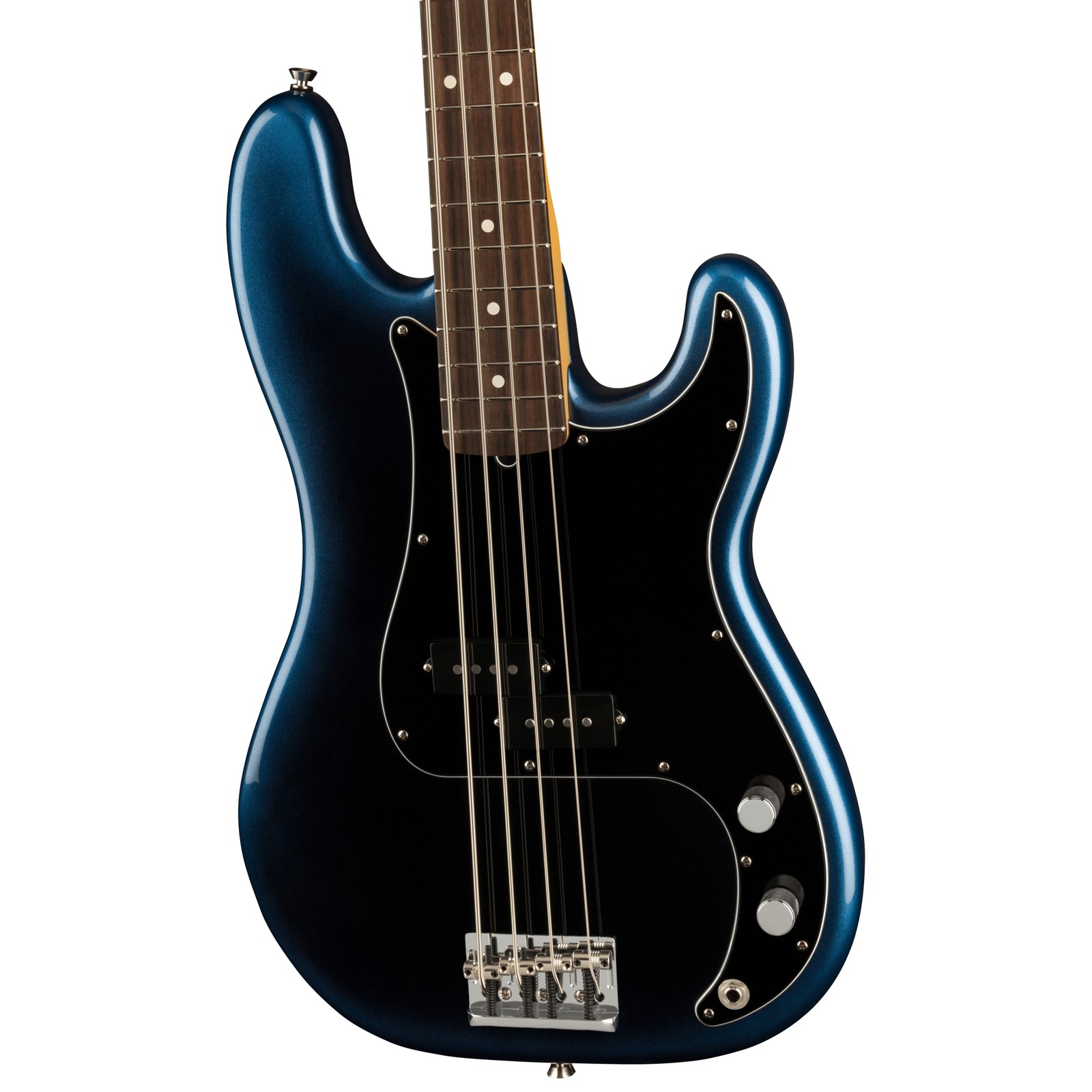 Die bewährte Basis aus einem Erlekorpus, einem Ahornhals und einem Palisandergriffbrett blieb beim American Professional II erhalten, ebenso wie die 20 Bünde. Der neue Posiflex-Graphitstab stabilisiert den Hals zusätzlich und macht ihn unempfindlicher gegenüber thermischen Veränderungen. Mit dem matten Satin Finish des Halses, den abgerundeten Griffbrettkanten und dem abflachten Halsfuß erhält man eine optimale Bespielbarkeit bis in die höchsten Lagen. Klanglich das wichtigste Update ist sicherlich der V-Mod II Split Coil Pickup, der für mehr Druck, Präzision, Dynamik und Ausgewogenheit zwischen den Saiten sorgt. Geblieben ist natürlich die passive Elektronik mit einem Volume- und einem Tone-Regler. Auch bei der Hardware gibt es Neuerungen, vor allem den konischen Schaft der Stimmmechaniken, der beim Saitenwechsel hilfreich ist und für mehr Schwingungsübertragung auf den Hals sorgt. Das Dark Night Finish verleiht dem American Professional II Precision Bass eine besondere Note abseits des Mainstreams.