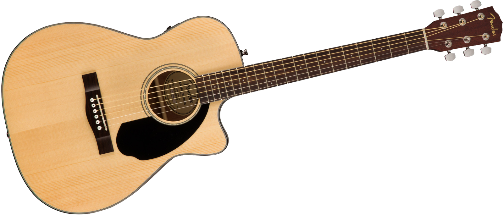 Die CC-60SCE NAT besitzt einen Concert-Korpus, dieser ist kleiner als der einer Dreadnought und bietet somit einen eher mittenorientierten Klang, der sich neben dem Strumming insbesondere für Fingerpicking oder den Bühneneinsatz eignet. Die Decke besteht aus massiver Fichte, der Korpus aus Mahagoni. Für den Hals wurde Mahagoni gewählt, während Griffbrett und Steg aus Nussbaumholz bestehen – eine überzeugende Alternative zum geschützten Palisander. Interessant ist noch die verwendete Mensur: Sie ist mit 25.3“ (643 mm) etwas kürzer als üblich und wird so eine durchaus spürbare, lockere Bespielbarkeit ermöglichen. Zur Übertragung des Sounds ist ein Fishman-Tonabnehmersystem eingesetzt, das auch über ein Stimmgerät verfügt. Ein zweiter Gurtpin am Halsansatz macht dazu das Spielen im Stehen angenehmer, als wenn das Ende des Gurtes an die Kopfplatte gebunden werden muss.
