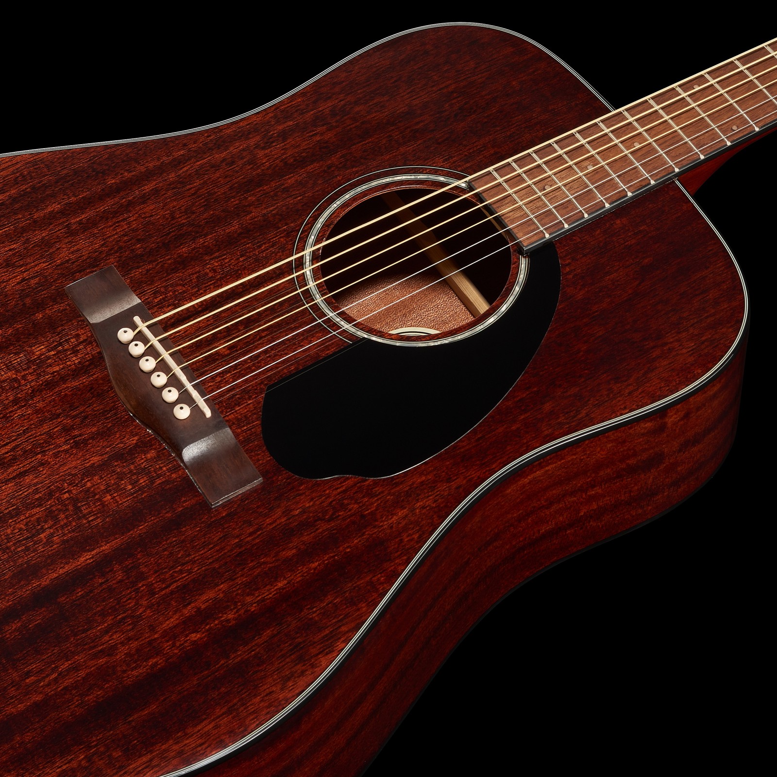 Die CD-60S All-Mahogany besitzt zwar einen Dreadnought-Korpus, dieser ist aber etwas anders geformt als der der meisten anderen Hersteller, nämlich runder und weicher. Die Decke besteht aus massivem, der Korpus aus gesperrtem Mahagoni. Für den Hals wurde ebenfalls Mahagoni gewählt – eben „All-Mahogany“ –, während Griffbrett und Steg aus Nussbaumholz bestehen, was eine überzeugende Alternative zum geschützten Palisander darstellt. Interessant ist noch die verwendete Mensur: Sie ist mit 25.3“ (643 mm) einen Hauch kürzer als üblich und ermöglicht so eine durchaus spürbare, lockere Bespielbarkeit.