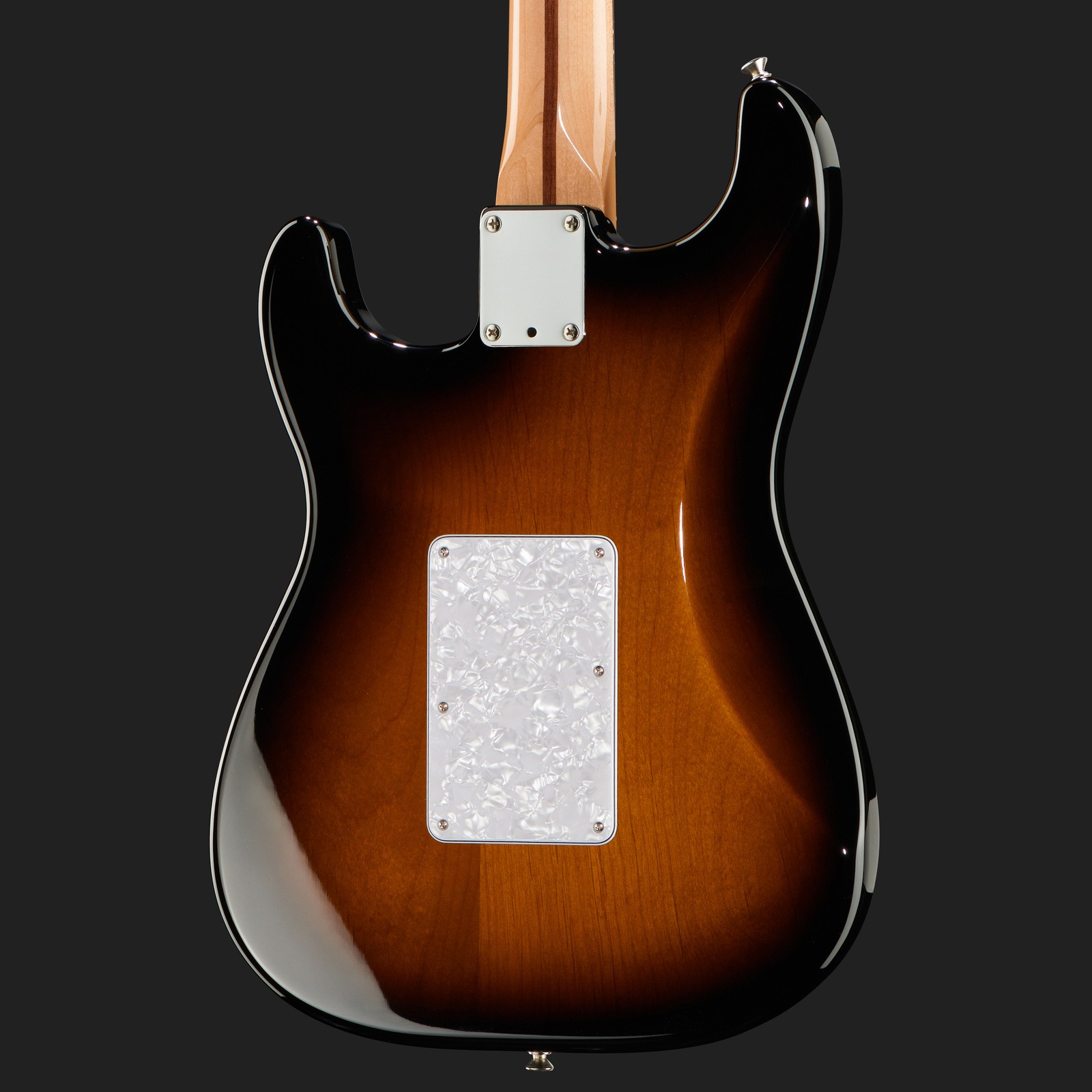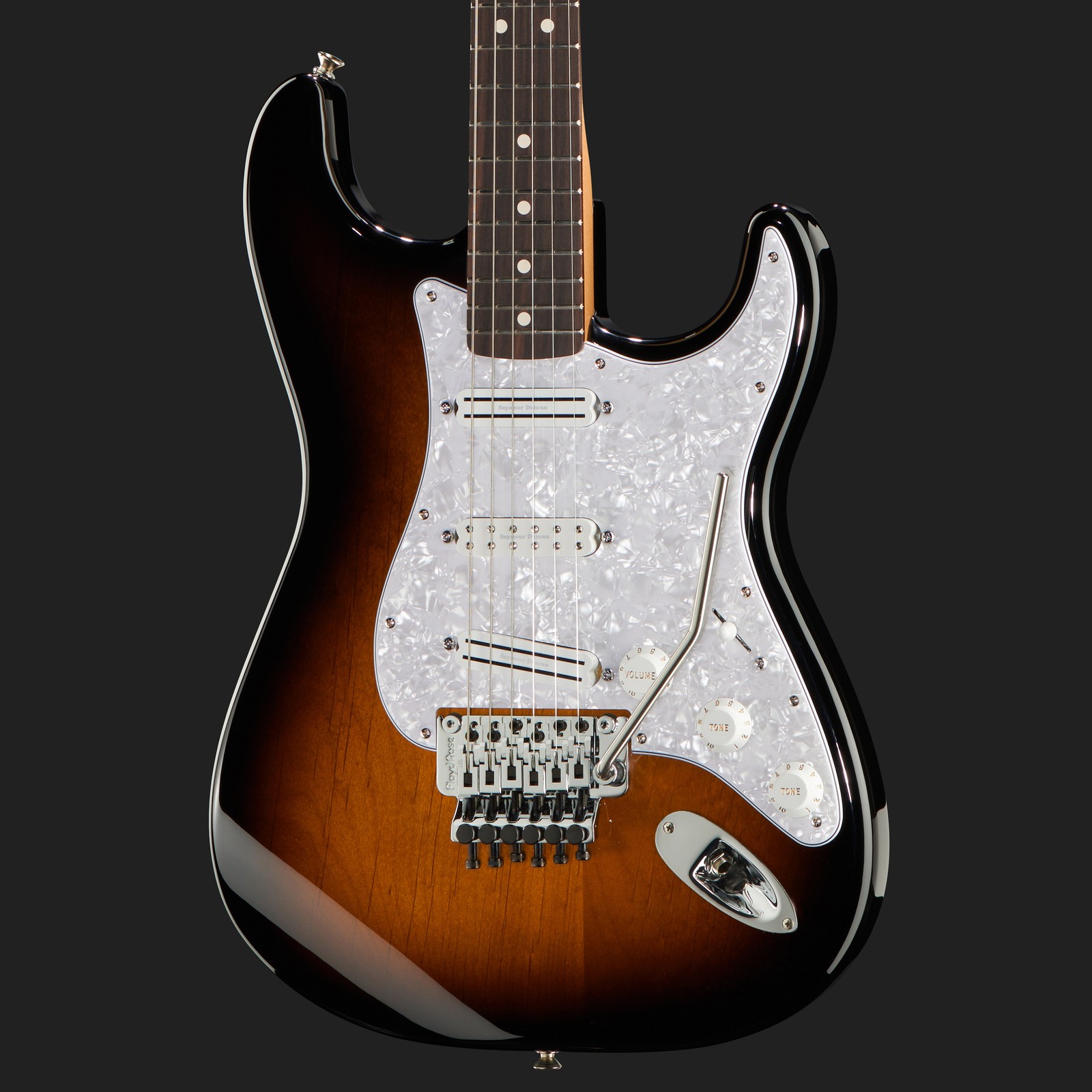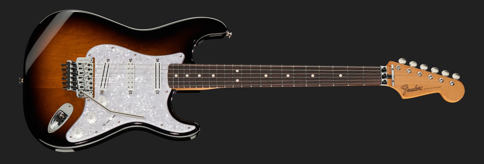 Von messerscharfen und durchdringenden Riffs mit dem Duncan am Steg, über warme und definierte Leadsounds des Front-Pickups bis hin zu den berühmten und bekannten Cleansounds einer Fender Strat in den Zwischenpositionen reicht das Repertoire der Fender Dave Murray Strat 2TSB. Genauso vielseitig wie die Spielweise des Künstlers zeigt sich auch sein Werkzeug im klassischen Sunburst-Finish. Dabei arbeitet die elektronische Schaltung auf dem Perlmutt-Pickguard gewohnt einfach und gleichzeitig effektiv: Ein Fünfwegeschalter und je ein Poti für Volume und Tone ermöglichen eine schnelle Auswahl der gewünschten Sounds. Von Push-Pull-Potis oder Mini-Switches, die die Bedienung nur unnötig kompliziert machen, ist weit und breit nichts zu sehen. Nicht fehlen darf an Dave Murrays Strat natürlich ein Vibrato, hier wird ein Original Floyd Rose System verwendet, das sich auch bei extremer Nutzung mit „Dive-Bombs“ stets absolut stimmstabil verhält.