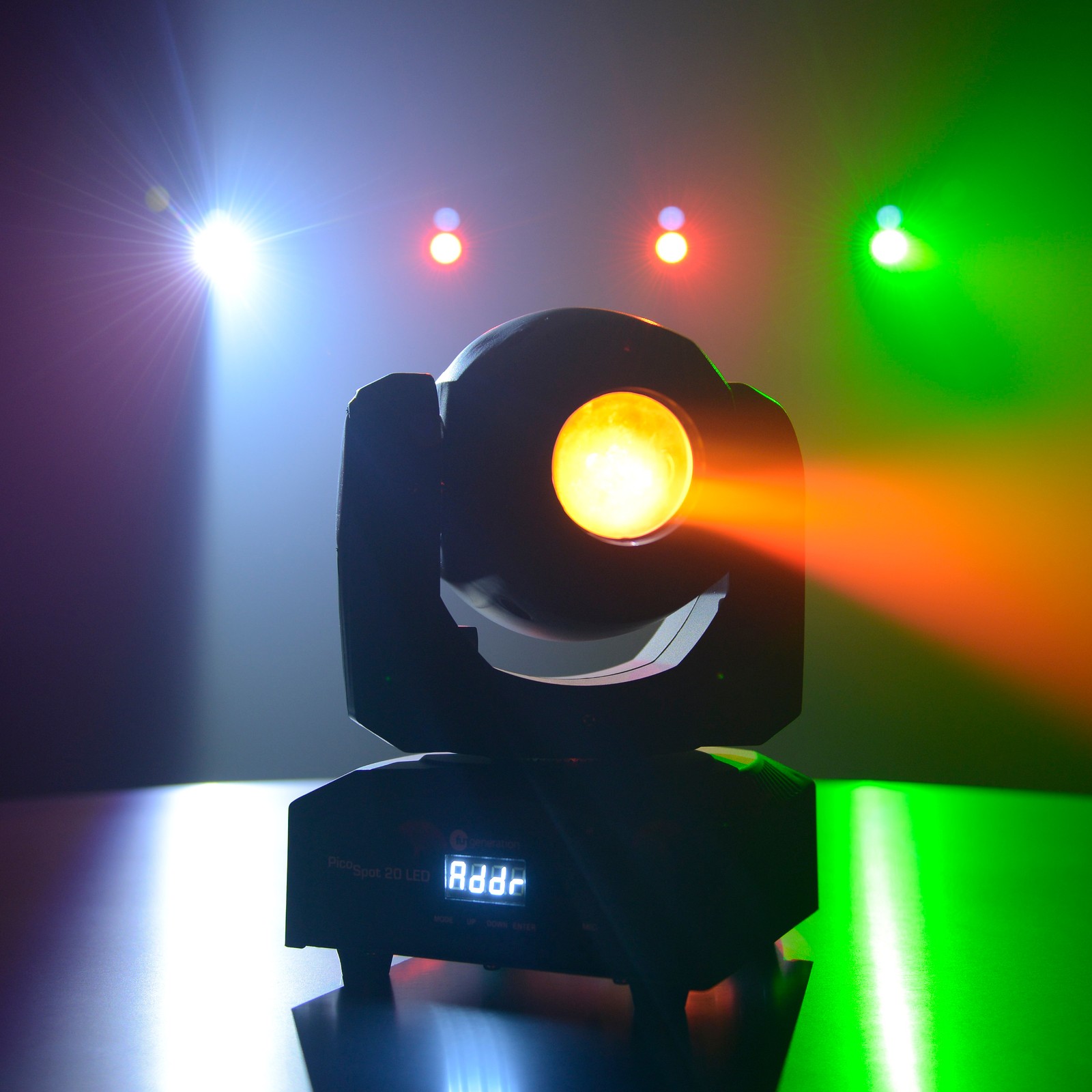 Der Fun Generation PicoSpot 20 LED ist ein auffallend kleines und relativ preisgünstiges Moving Light. Es punktet mit in dieser Preisklasse seltenen Gobos. Vor der weißen 12 Watt-LED kann ein Farbrad buntes Licht erzeugen. Der Beam ist vergleichsweise schmal. Eine weitere Besonderheit ist, dass der PicoSpot 20 LED mit einer Fernbedienung angesteuert werden kann. Diese ist bereits im Lieferumfang enthalten. Des weiteren liegen dem Scheinwerfer ein Netzkabel und ein Omega-Bracket zur Montage an Decke oder Traversen bei. Sogar eine einschraubbare Öse für ein Sicherungsseil wird mitgeliefert. Wer bewegtes Effektlicht von unten nach oben strahlen lassen möchte, kann den Spot auch einfach auf den Boden stellen.