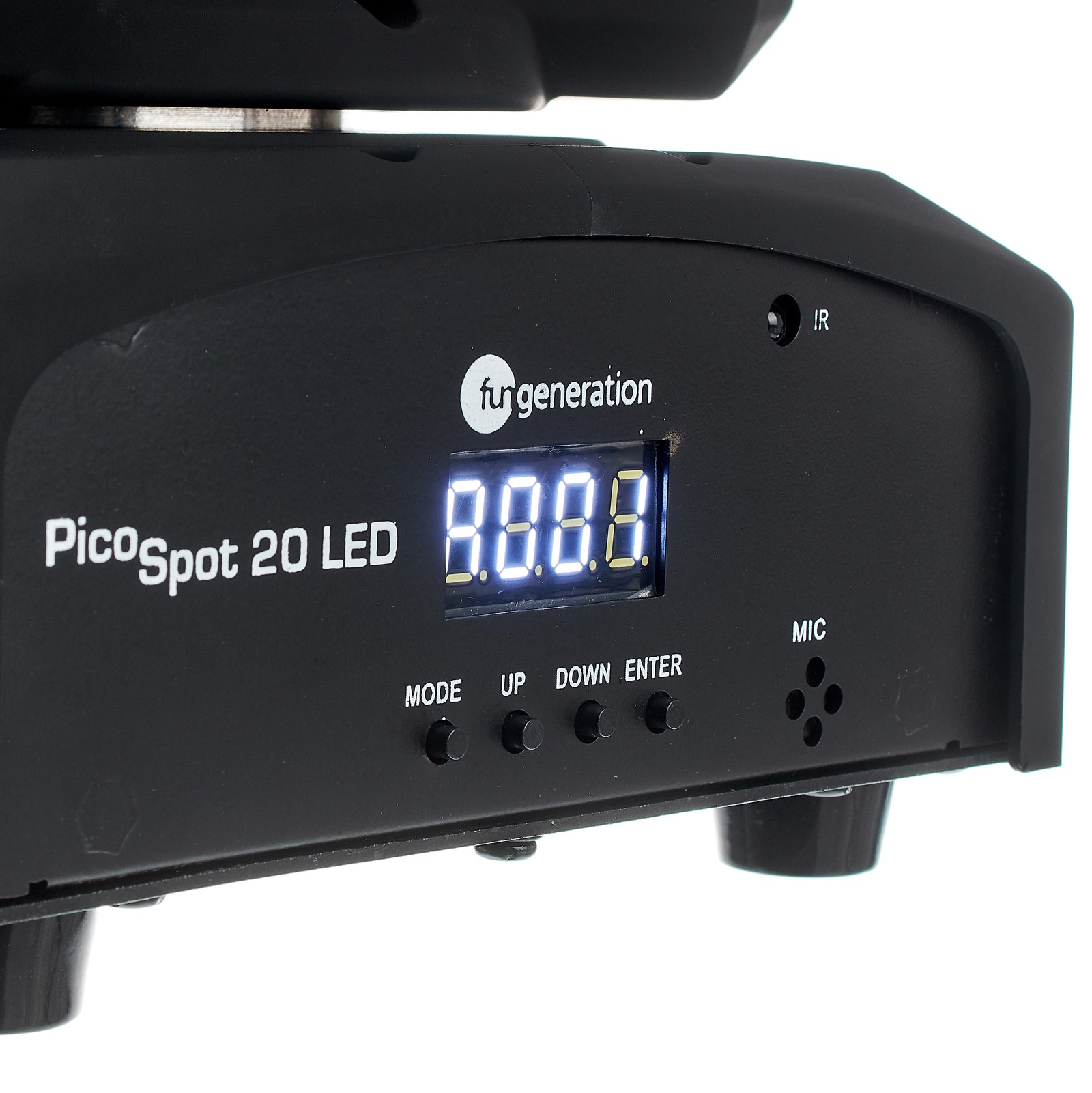 Der Fun Generation PicoSpot 20 LED arbeitet mit einer weißen 12 Watt-CREE-High-Performance-LED. Sie bietet ein Tageslichtweiß von 8000 Kelvin in einem 13° schmalen Beam. Vor der LED kann ein Farbrad sieben Farben plus Weiß erzeugen. Des weiteren sind sieben statische Gobos plus offen an Bord. Ein PicoSpot 20 LED misst gerade einmal 162 x 242 x 174 mm und bringt 3 kg auf die Waage. Er kann mit den Menütasten am Gerät, einem DMX-Lichtpult oder der beiliegenden Fernbedienung gesteuert werden. Diese benötigt Sichtkontakt zum entsprechenden Infrarotsensor. Man findet ihn im Sockel des Spots rechts oberhalb des Displays. Mit der Fernbedienung kann man sieben bereits vorprogrammierte Shows, die Stroboskopfunktion und die Musiksteuerung aktivieren oder Farben und Bewegungen manuell einstellen.