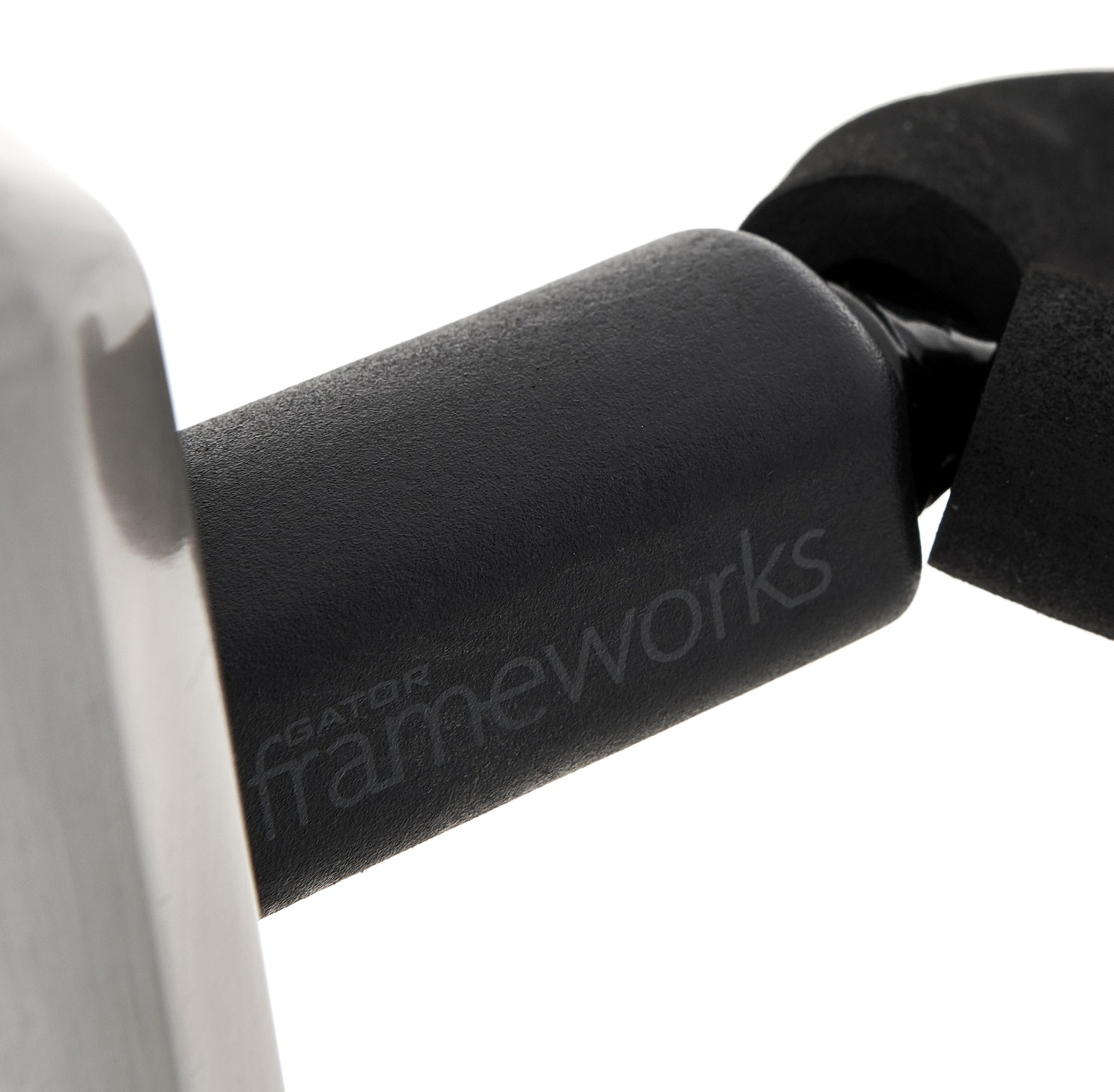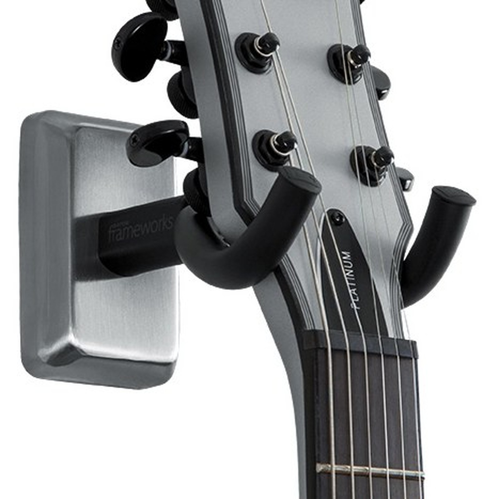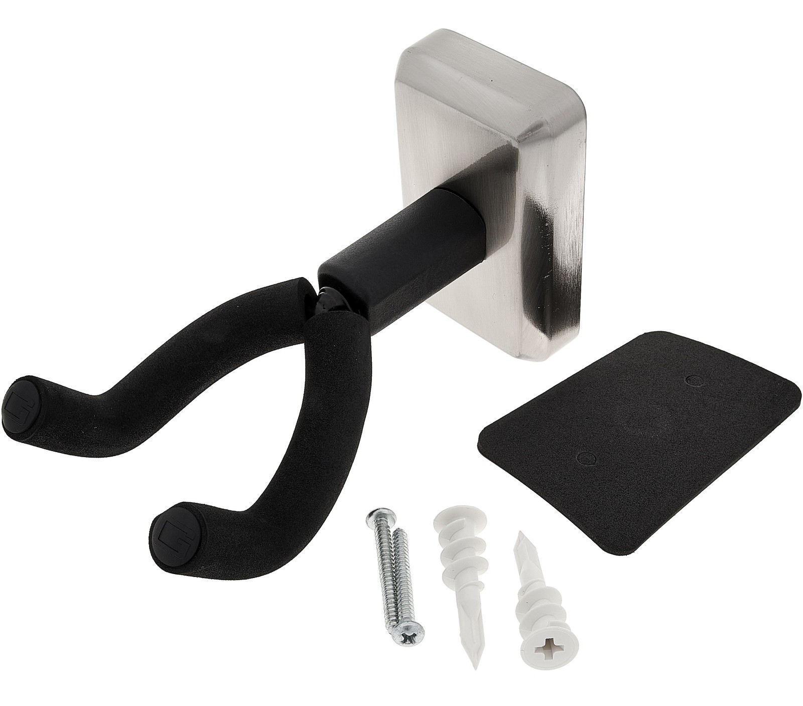 Wer seine Wände lieber mit seinen Instrumenten anstatt mit Bildern schmücken möchte, ist bei dieser schicken Wandhalterung im Chromlook von Gator richtig aufgehoben. Besonders, wenn man viele verschiedene Saiteninstrumente im Besitz hat, ist eine Anschaffung dieser Halterung sinnvoll. Mehrere Wandhalterungen sind nämlich nicht nur platzsparend; das gepolsterte Drehgelenk passt sich auch dem Instrument und seiner Kopfform an. Damit sind auch Offset-Kopfformen kein Problem. Nur auf die Lackierung seiner Instrumente sollte der Käufer Acht geben. Die Halterung ist sicher für alle Instrumente mit Standard-Polyurethan-Oberflächen/Lacke, für Nitrolacke, wie beispielsweise von Gibson verwendet, dagegen wird sie nicht empfohlen.