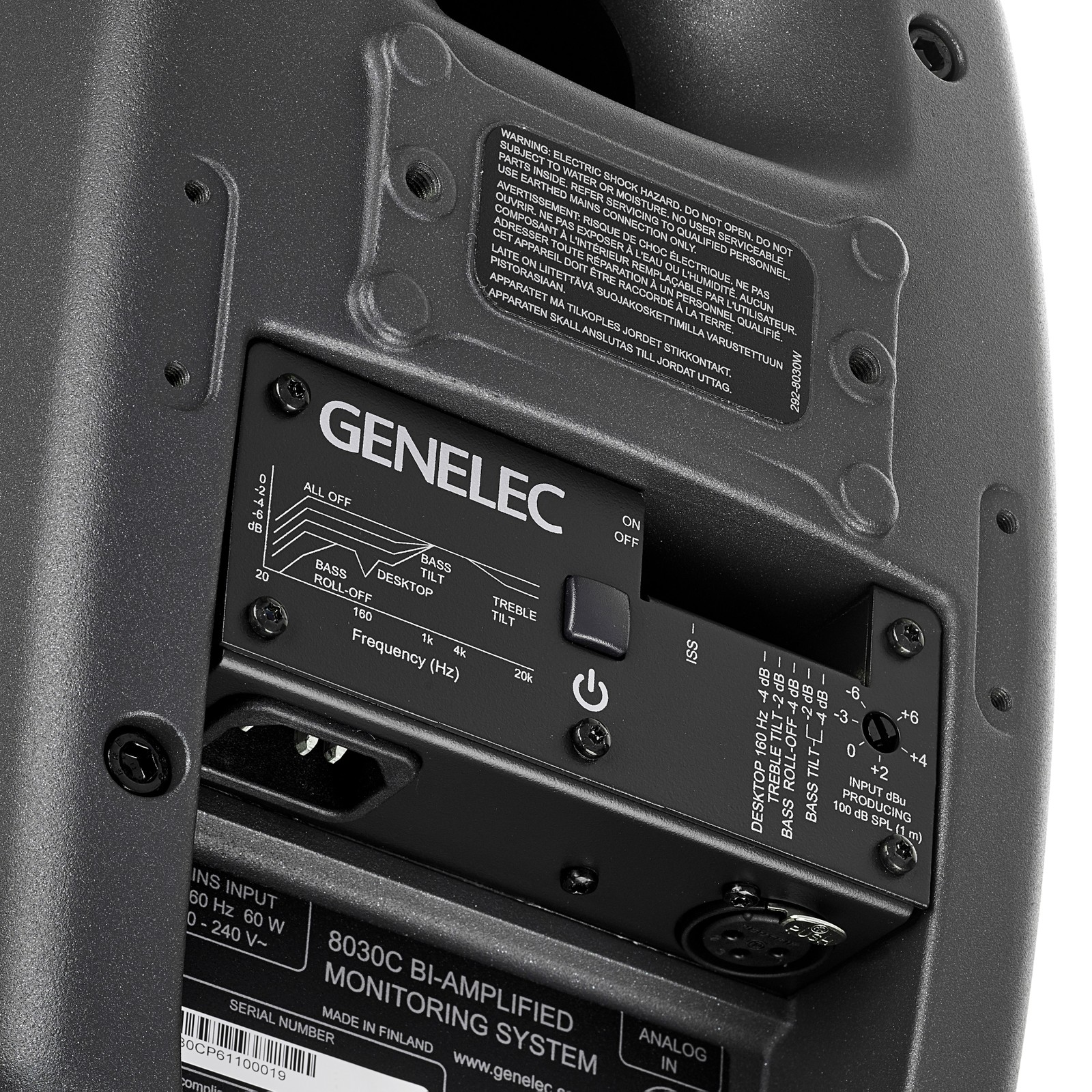 Mit einem Frequenzbereich, der von 54Hz bis 20kHz reicht, ist der Genelec 8030CP als Kompaktmonitor auch im Bassbereich gut aufgestellt. Zu diesem Zweck setzt der Lautsprecher auf Bassreflextechnik, die das Optimum aus seinem tieffrequenten Schalldruck herausholt und den Übertragungsbereich der Membranen erweitert. Zur Raumanpassung lassen sich bei diesem Modell die Bassfrequenzen wahlweise um -2dB oder -4db absenken oder gar abschneiden. Auch die Höhen können um -2dB abgesenkt werden. Steht der Lautsprecher auf einer reflektierenden Fläche, kann das Aktivieren seiner "Desktop Control"-Funktion dafür sorgen, dass Frequenzen zwischen 160 und 200Hz nicht störend überhand nehmen. Die (deaktivierbare) Autostartfunktion des Speakers erkennt, ob ein Signal anliegt und schaltet die Verstärkereinheit gegebenenfalls selbsttätig ein. Das macht die Bedienung des Speakers einfach und spart Strom.
