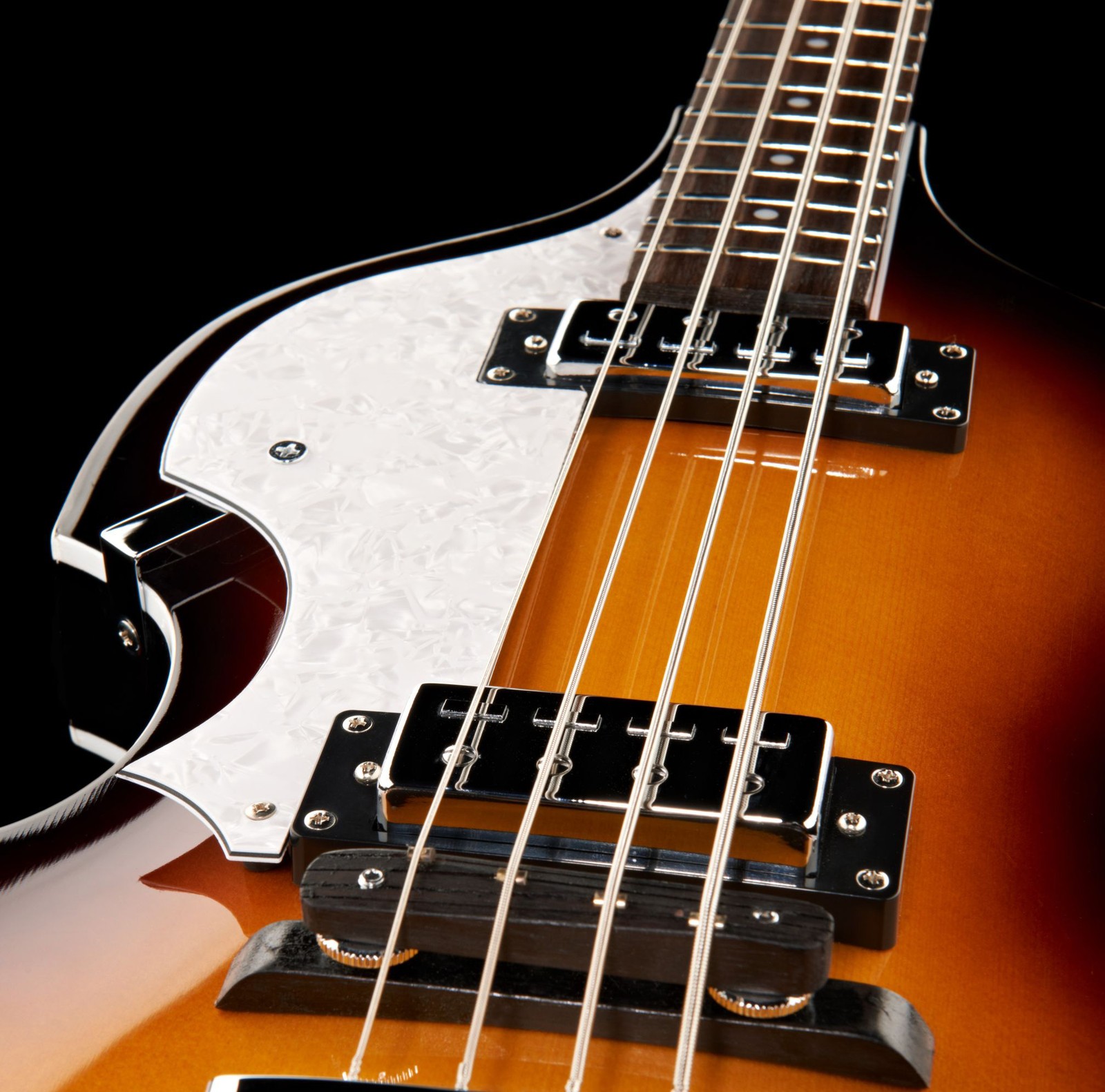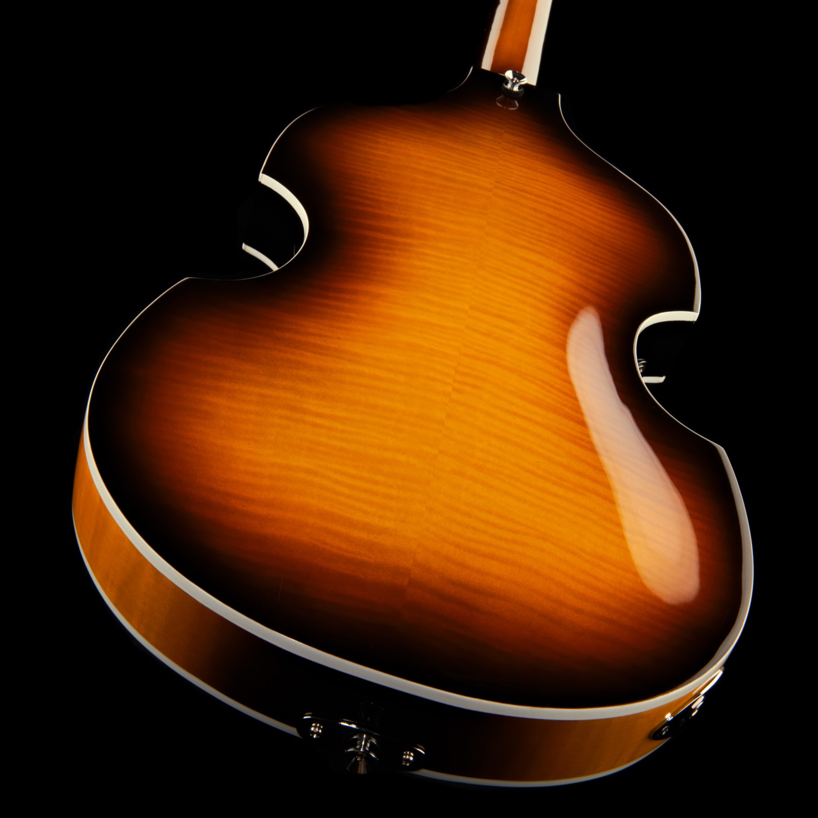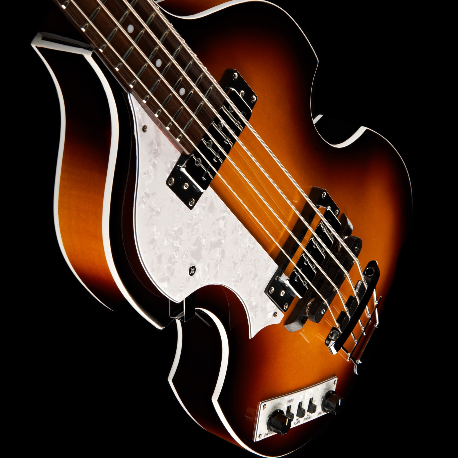 Schon bald nach seinem Erscheinen im Jahr 1956 bekam der Höfner 500/1 den Beinamen Violin Bass, da er sich an der Form klassischer Streichinstrumente orientiert. Der kompakte Korpus besteht aus Ahorn und wird mit einer Decke aus Fichte veredelt. Ähnlich akustischen Instrumenten ist er hohl und bringt so eine holzige Note in den Ton. Die Mensur, also die Länge der schwingenden Saite, beträgt 76 cm gegenüber den herkömmlichen 86 cm. Somit ist auch der Hals aus Ahorn mit dem Griffbrett aus Jatoba entsprechend kürzer, was für eine sehr angenehme Bespielbarkeit sorgt. Die luftige und schwingungsfreudige Konstruktion der Brücke lehnt sich ebenfalls an klassischen Streichinstrumenten an. Die beiden Höfner Humbucker und die passive Elektronik mit zwei Volumereglern und drei Schaltern sorgen für eine breite Palette an Vintage- und Retrosounds.