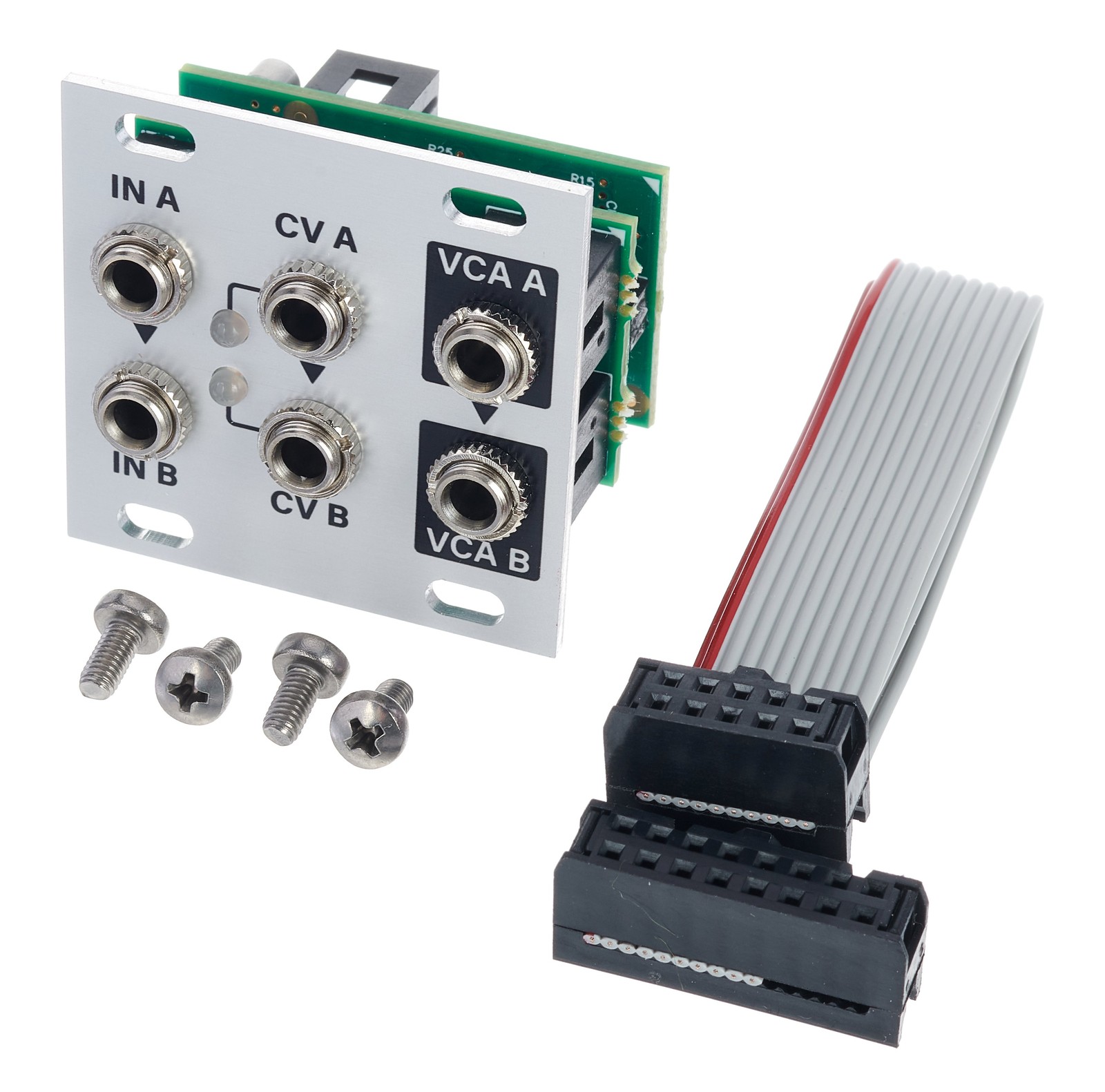 Die beiden VCAs können entweder völlig unabhängig voneinander oder über die praktische Signalnormalisierung im Tandem verwendet werden. Durch die DC-Kopplung kann der VCA für die Amplitudenregelung sowohl von Steuerspannungen (CV) als auch von Audiosignalen verwendet werden. Auf diese Weise kann zum Beispiel die Lautstärke eines Oszillators mit einer Hüllkurve gesteuert oder der Pegel eines LFOs geformt werden. Mit einem Oszillator können Obertöne in den Seitenbändern hinzugefügt werden, indem ein Oszillator in der Audiorate verwendet wird und sein Pegel gesteuert wird. Jede beliebige andere Kombination von Signalen, die im Synthesizer-System zusammengestellt werden können, ist möglich.