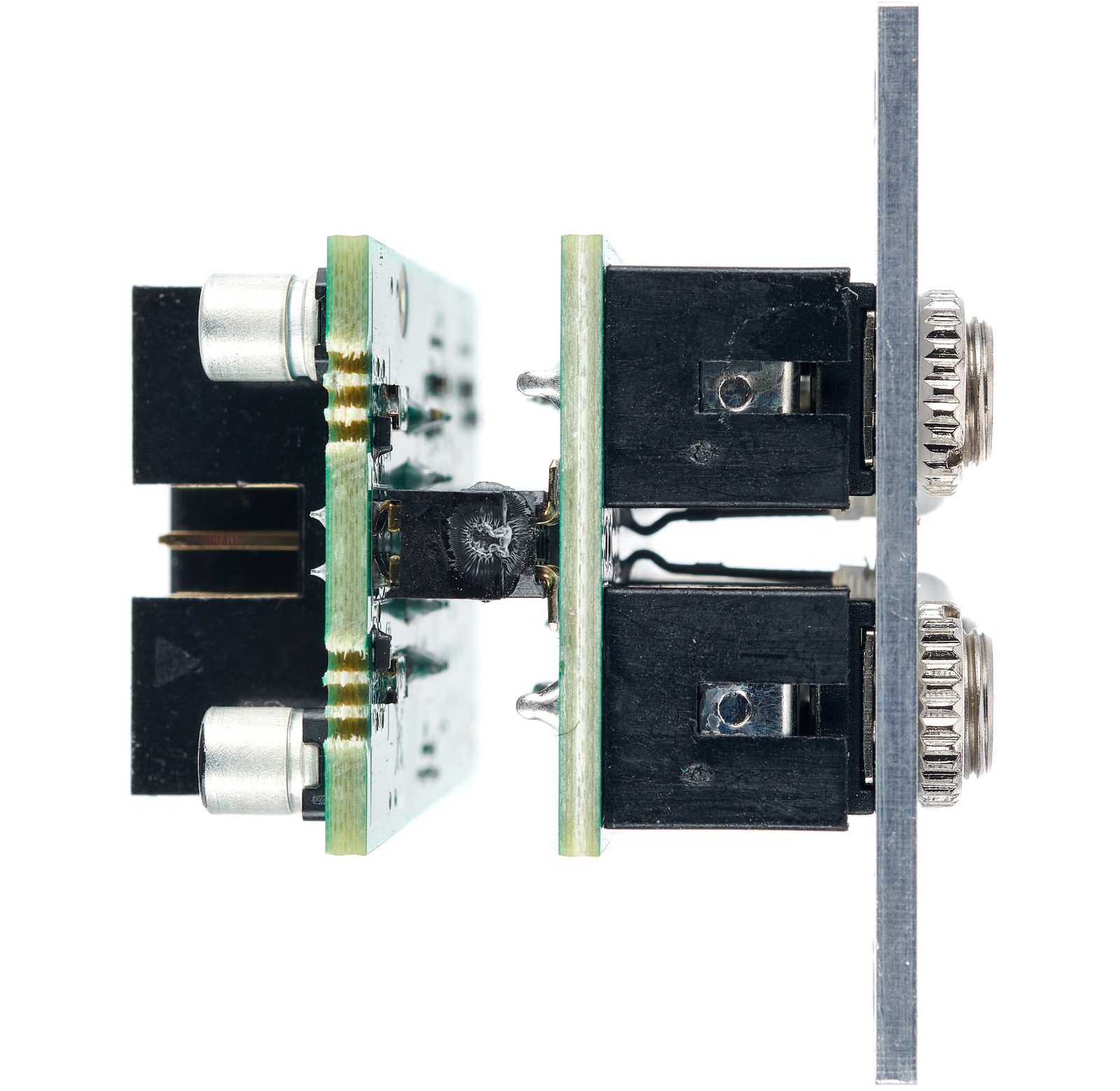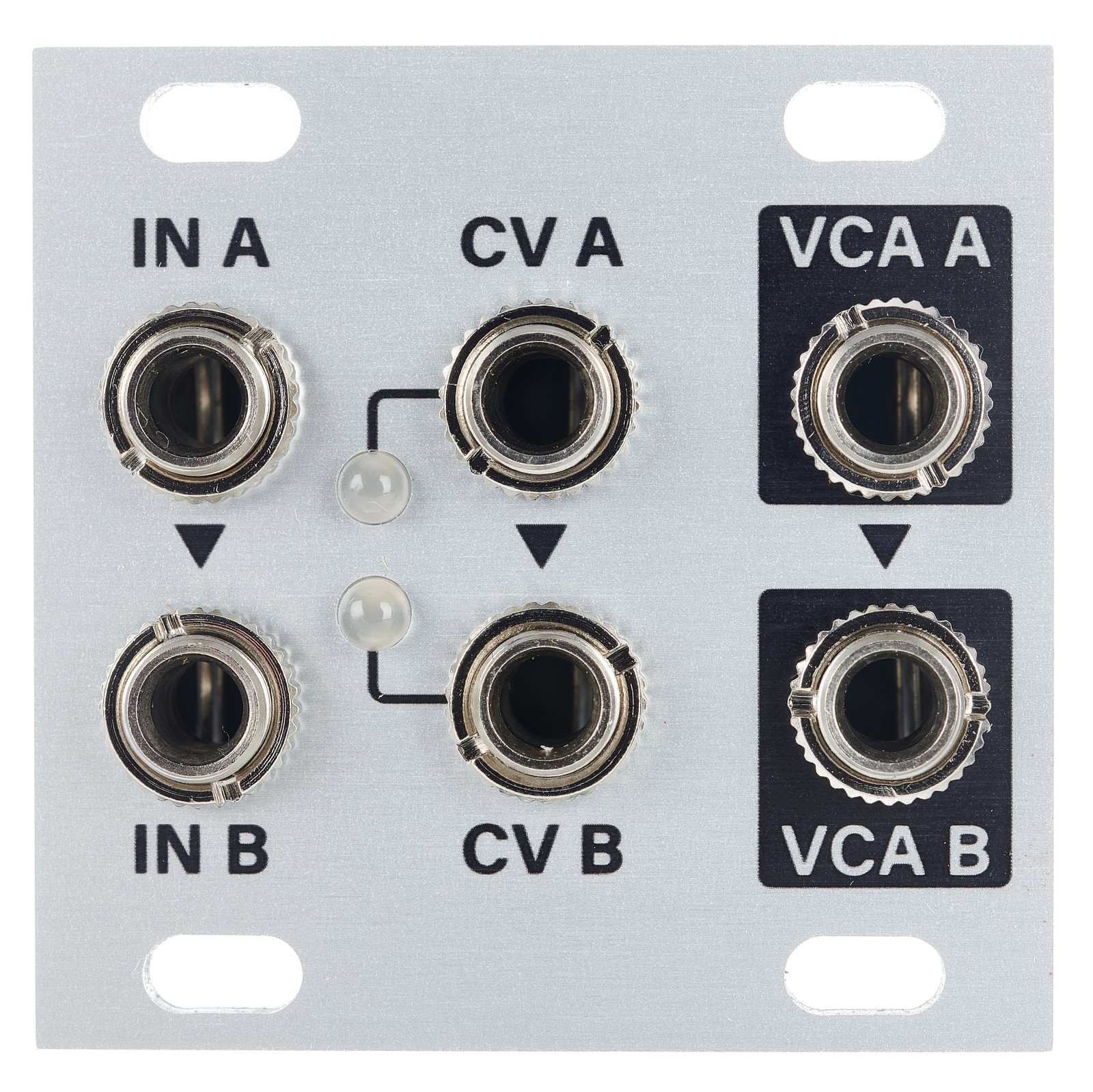 Das in einen der beiden Eingänge eingehende Signal wird durch den spannungsgesteuerten Verstärker verarbeitet und über die VCA-Ausgangsbuchsen ausgegeben. Über Ausgang B ist eine Spannungsverdopplung möglich. Wenn an Eingang B kein Signal angeschlossen ist, erhält der VCA-Kanal B das Signal von Eingang A. Eine CV-Quelle kann verwendet werden, um den Pegel von zwei separaten Eingängen zu steuern. Wenn an CV B nichts angeschlossen ist, steuert das Eingangssignal CV A beide Kanäle. Zwei Signale können auch miteinander vermischt werden. Wenn nichts am Ausgang des VCA A angeschlossen ist, wird das Signal mit dem Ausgang des VCA B summiert. Die LEDs zeigen ein eventuell vorhandenes CV-Signal an. Der Ausgang von VCA A kann auch auf den Eingang von B geroutet werden, um eine komplexere Lautstärkeregelung zu erhalten oder den Ausgang von A zur Steuerung des Pegels von B zu verwenden.