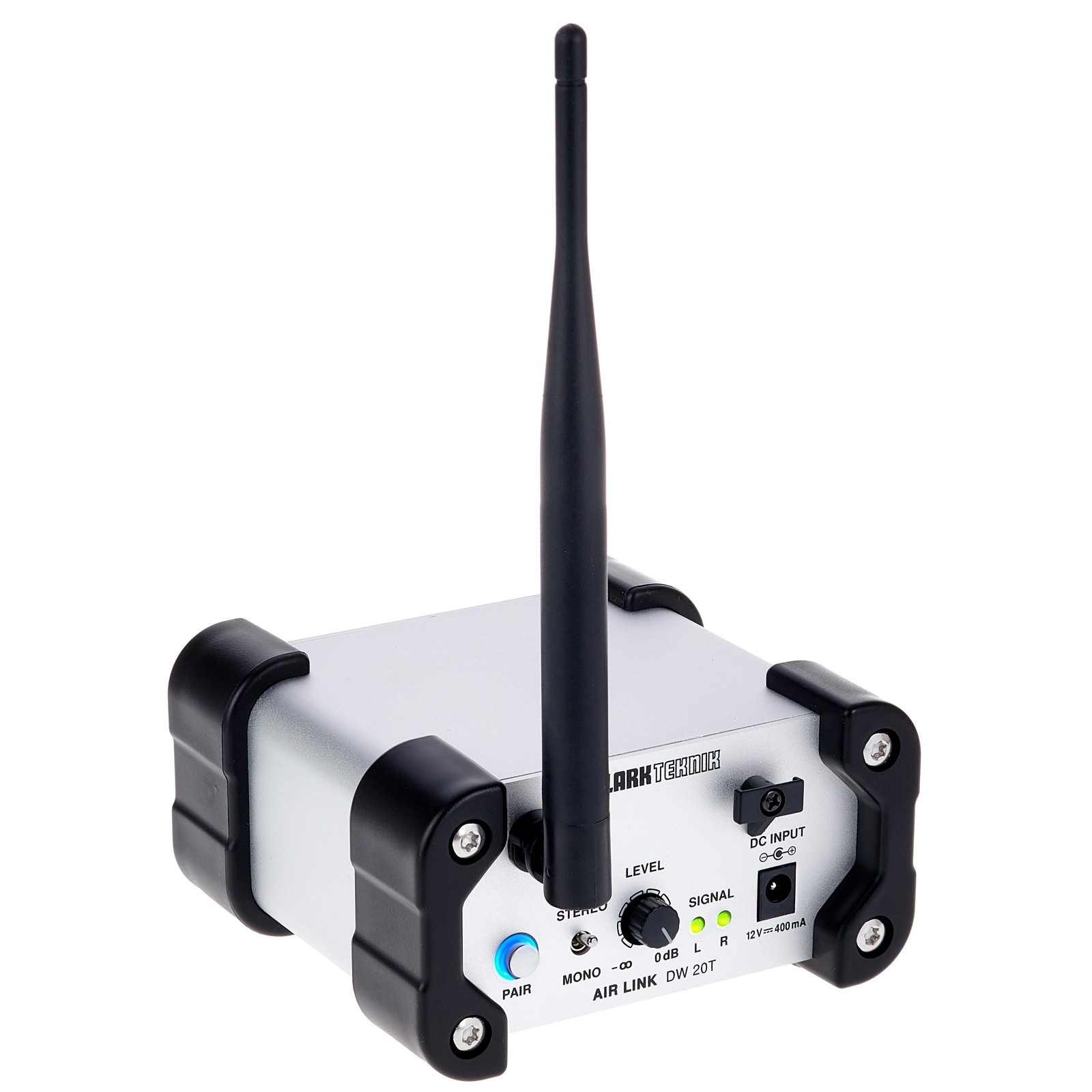 Mit dem Air Link DW 20T stellt Klark Teknik einen Stereo-Sender für professionelle Anwendungen vor, der Signale bei einer Frequenz von 2,4GHz drahtlos an den separat erhältlichen Empfänger Air Link DW 20R überträgt. Die externe Gelenkantenne verspricht dabei eine Reichweite von bis zu 30m. Die Signale werden entweder über die beiden XLR-Eingänge oder die 6,3mm-Klinkenanschlüsse auf der Rückseite in den Air Link DW 20T eingespeist. Der Sender kann nur mit dem separat erhältlichen Empfänger Air Link DW 20R verwendet werden. Zusammen bietet dieses System die höchste Übertragungsqualität. Seine kompakte und robuste Bauweise bewährt sich bei einer Vielzahl von Anwendungen – von Festinstallationen bis hin zu Live-Tourneen.