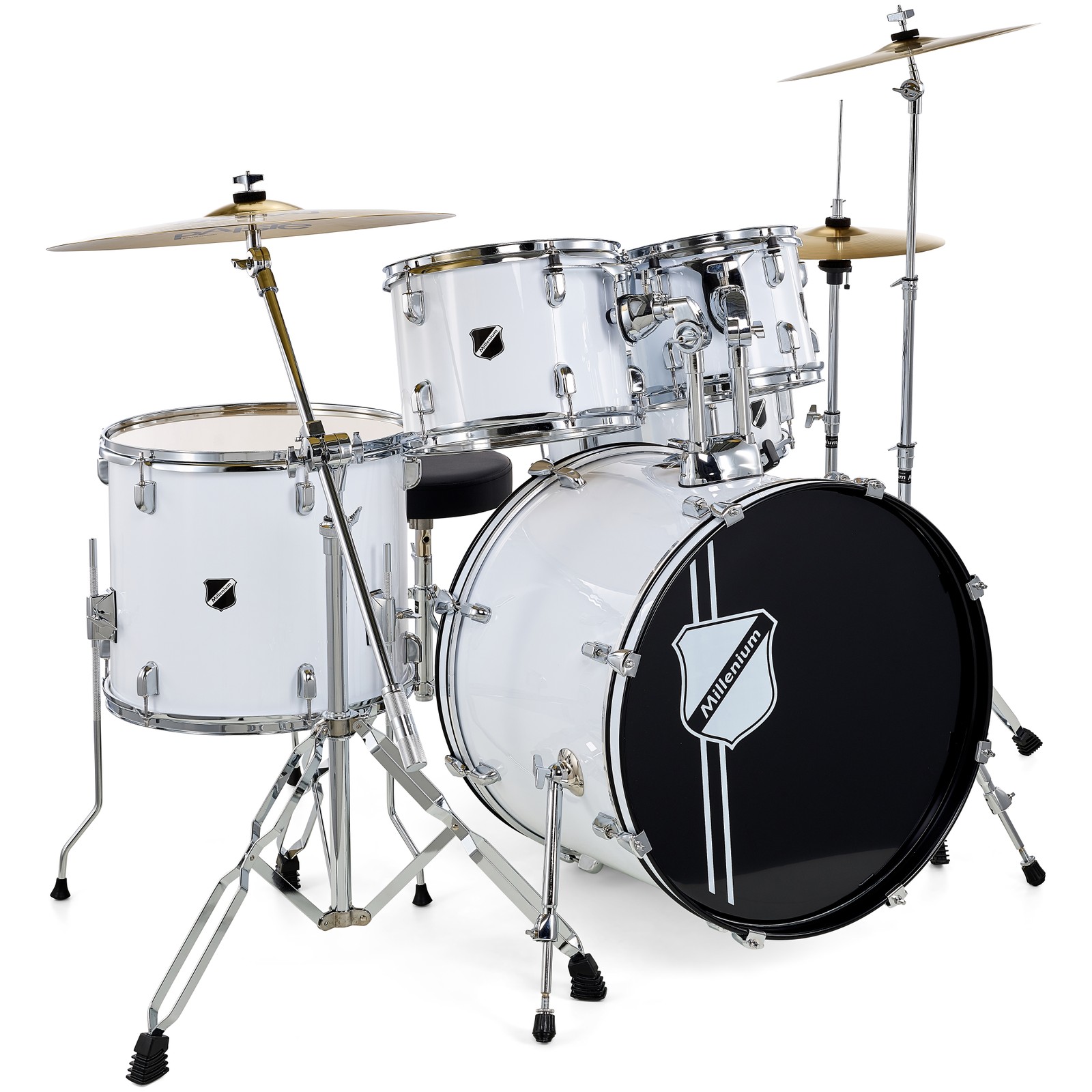 Das Millenium Focus 20 Drum Bundle White ist ein Rundum-sorglos-Paket für die ersten Takte ambitionierter Einsteiger. Es bietet „out of the box“ alles, um nach dem Auspacken, Aufbauen und Stimmen direkt loslegen zu können. Neben dem fünfteiligen Kesselsatz sind zunächst zwei Becken (14“-Hi-Hat, 16“-Crash/Ride), alle benötigten Ständer inkl. Hi-Hat-Ständer, eine Fußmaschine für die Bass Drum und auch ein Schlagzeughocker im Lieferumfang enthalten. In dieser Preisklasse fast schon sensationell: die stabile, doppelstrebige Hardware sowie ein überaus nützliches Zubehörset mit einem Dämpfkissen für die Bass Drum und vier Soundringen für Snare Drum und Tomtoms. Exklusiv in der Bundle-Version des Millenium Focus 22: ein zusätzliches 20“-Ride-Becken von Paiste sowie ein dazu passender Beckenständer mit Galgenarm.