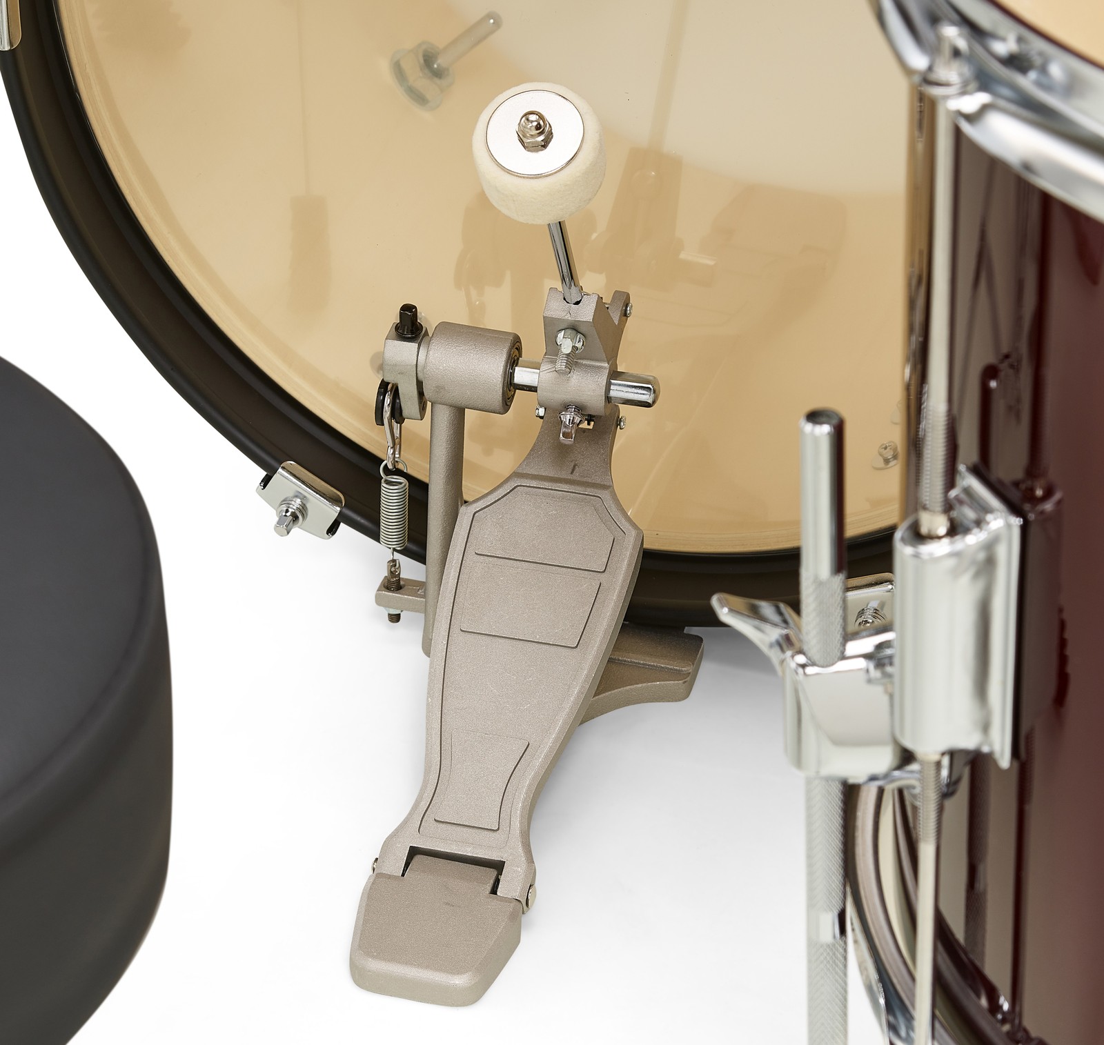 Features und Zubehör des Millenium Focus Junior Drum Set Red können sich sehen lassen! Die mitgelieferten Becken sorgen dafür, dass Junior direkt losrocken kann. Hi-Hat- und Bass-Drum-Pedal verfügen über einen langlebigen Kettenantrieb und die verchromte, einstrebige Hardware ist stabil und langlebig. In der Praxis erweist sich auch das beiliegende Bass-Drum-Kissen als wertvolles Add-on: Zum einen eliminiert es das oft unerwünschte, hochfrequente „Doing“ beim Anschlagen einer ungedämpften Bass Drum; zum anderen lassen sich damit je nach Positionierung und Ausrichtung Schlag- und Resonanzfell dämpfen. Das verleiht dem Sound der Bass Drum mehr „Punch“ und verbessert das Spielgefühl am Pedal.