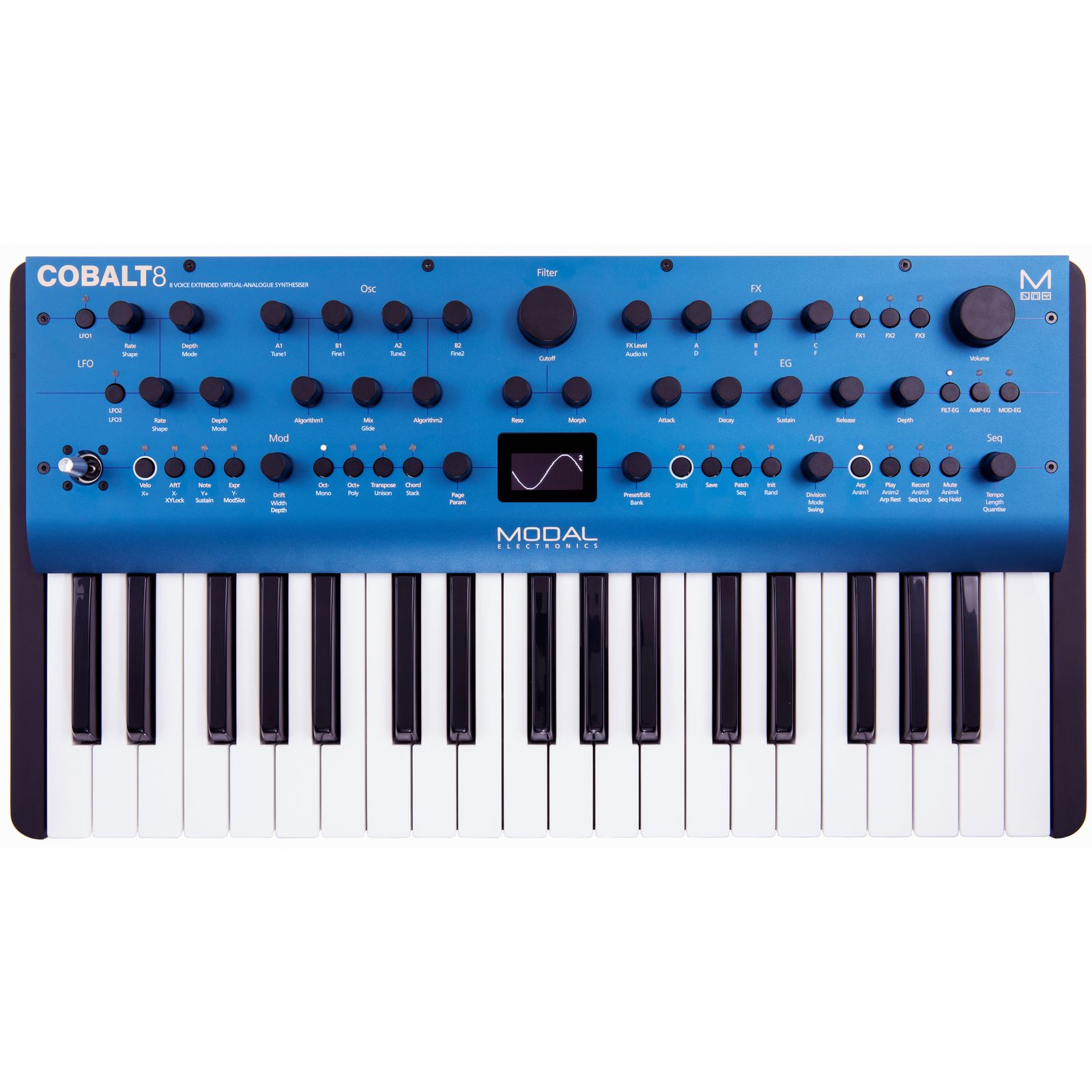 Beim Cobalt8 handelt es sich um einen analog-virtuellen Synthesizer – sprich: um einen Hybrid-Synthesizer, der von analogen Schaltungen und digitalen Bauelementen Gebrauch macht. Ausgestattet ist er mit zwei Oszillatorgruppen mit wählbaren Algorithmen in eigenständigen Modulen, die somit mehrere Oszillatormodulationen ermöglichen. Des Weiteren besitzt er ein vierpoliges, morphbares Ladder Filter, einen Arpeggiator, einen 64-stufigen Step-Sequenzer und drei unabhängige DSP-Effekte. Er ist achtstimmig polyphon und besitzt 37 anschlagsdynamische Tasten mit Aftertouch. Mit dem Cobalt8 präsentiert Modal Electronics einen vielseitigen Synthesizer, der das volle Potenzial aus analoger und digitaler Technik schöpft und sich damit bestens für warme, klassische Analogsounds sowie für moderne, digitale Klänge eignet.