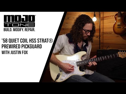 Das Mojotone 58 Quiet Coil HSS Pickguard BK ist ein dreilagiges Schlagbrett für E-Gitarrem im ST-Style, das mitsamt Tonabnehmern, Pickup-Wahlschalter und Reglern kommt. Das Schlagbrett hat elf Lochbohrungen an den klassischen Punkten eines ST-Modells und ist komplett vorverdrahtet. Entsprechend kann es ohne aufwändiges Bohren oder Löten direkt verschraubt und genutzt werden. Neben der Standardverkabelung ermöglicht das Set auch eine Blender-Verkabelung, bei der ein Regler als Master-Tonregler und ein weiterer als Einblendregler für den Hals-Pickup und den Stegtonabnehmern agiert. Eine Besonderheit ist das Treble-Bleed-Feature des Volume-Reglers. Er sorgt dafür, dass Höhenanteile beim Herunterregeln der Lautstärke nicht verlorengehen.
