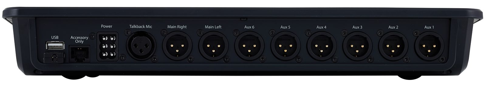 - 16 Ausgänge: Stereo Main XLR, 6 Aux XLR, 2 Stereo Aux Klinken, 1 Stereo Cue Klinke, 1 Stereo Monitor Klinke