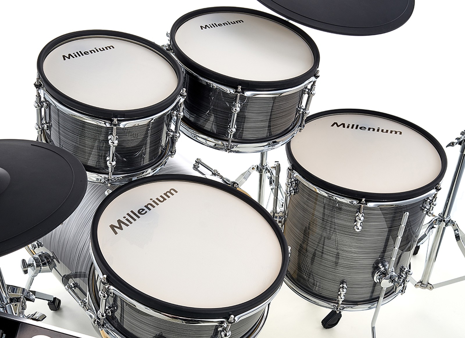Das MPS-1000 ist das Spitzenmodell unter den Millenium E-Drumsets. Auffälligstes Merkmal sind die mit Mesh Heads bespannten Holzkessel, deren Optik den Eindruck eines akustischen Schlagzeugs erweckt. Im Zentrum steht eine 20“-Bassdrum, die ergänzt wird durch 10“- und 12“-Racktoms sowie eine 14“-Floortom und eine 13“-Snaredrum. Hinzu kommen eine 13“-Hi-Hat, ein 15“-Crash und ein 18“-Triple-Zone-Ride. Aber nicht nur äußerlich macht das Kit eine tolle Figur, mit 820 Sounds samt umfangreicher Effektabteilung sowie 335 MB Kapazität zum Speichern eigener Samples – das entspricht rund 30 Minuten Stereo-Sampling – stimmen auch die inneren Werte. Dank Bluetooth-Schnittstelle kann kabellos zur Musik vom Smartphone getrommelt werden.