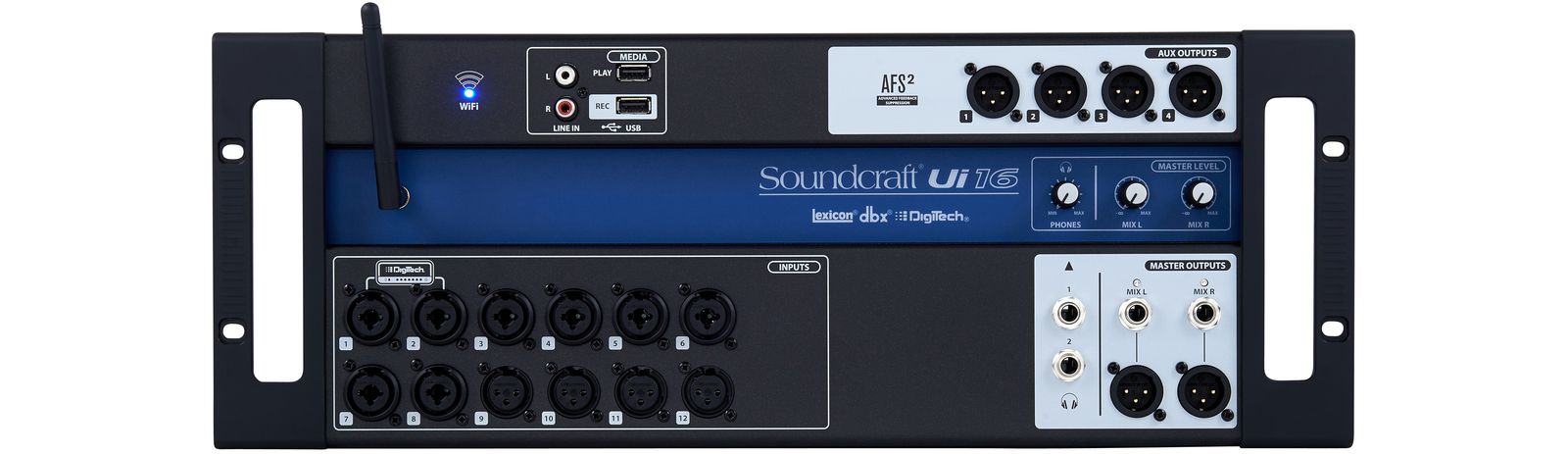 Das Soundcraft Ui16 ist alles andere als ein konventionelles Live-Mischpult. Denn das 4-HE-19“-Gerät zeigt bereits optisch erhebliche Unterschiede zu den Klassikern. Kein Wunder, schließlich handelt es sich hier eher um eine Kombination aus Stagebox, Router und Effekteinheit über den integrierten DSPs. Das eigentliche Mixing erfolgt via Smartphone, Tablet oder PC. Das ist allerdings kein Nachteil, denn dadurch gehören überlange Kabel, extra Stageboxen und ähnliches der Vergangenheit an. Darüber hinaus ist auch das Monitoring aller Teilnehmenden auf der Bühne einfacher.