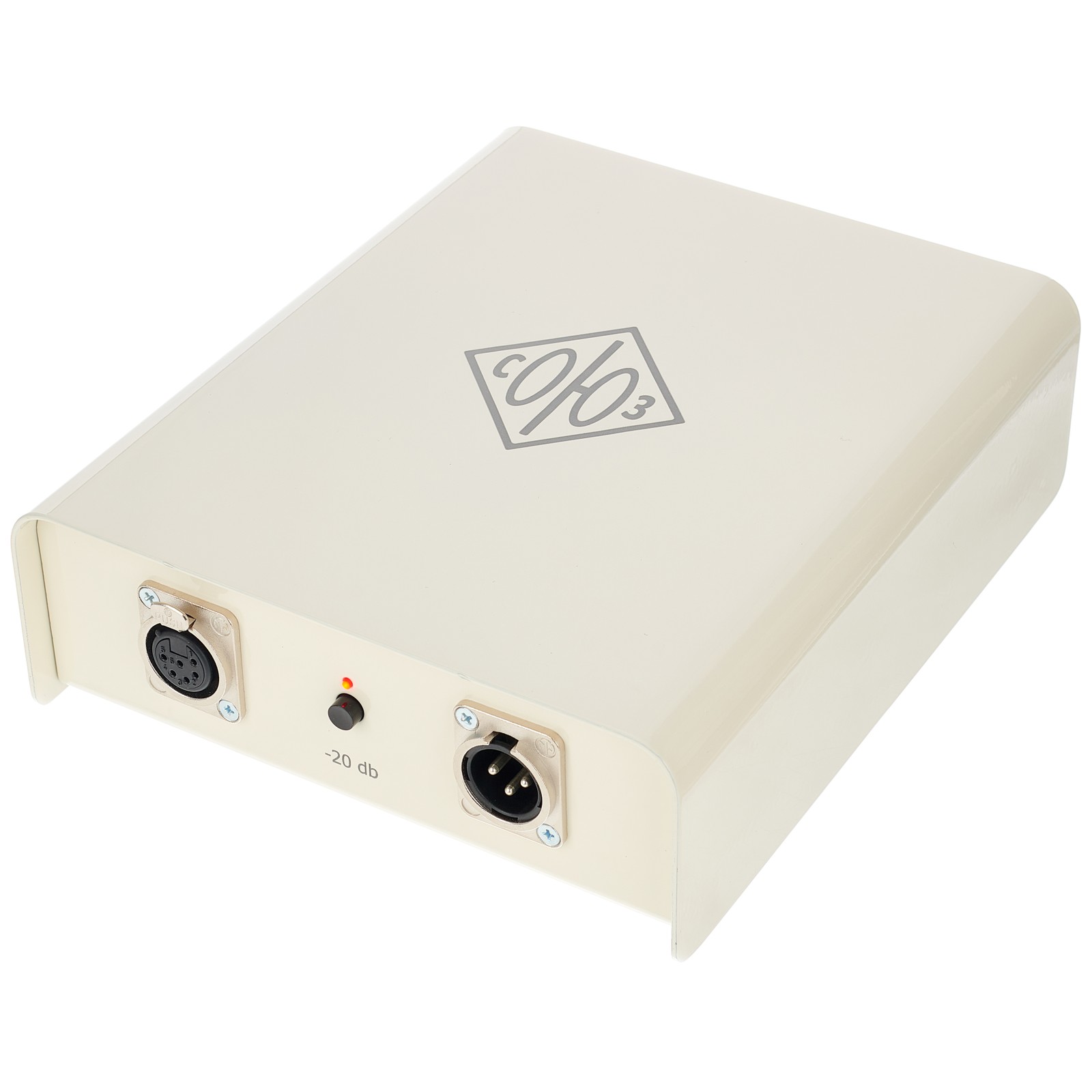 Die S17-Kapsel des Mikrofons basiert lose auf der K76-Kapsel aus den 1960er-Jahren. Sie wurde nun von Soyuz weiterentwickelt und besteht aus einer vergoldeten, handabgestimmten Membran mit einem Durchmesser von 34mm. Die originalen Impedanzwandler verfügen über einen sehr großen Eingangs- und einen kleinen Ausgangswiderstand, was sich auch beim 017 Tube zeigt. Die gesamte Schaltung ist in einen runden, horizontalen Mittelteil über Verstrebungen aus reinen Messingpfosten verschraubt. Über das Netzteil lässt sich der Pegel um 20dB absenken. Der entsprechende Schalter befindet sich praxisnah auf der Vorderseite zwischen den beiden Anschlüssen am Netzteil, welches auf der Rückseite eingeschaltet und über einen Kaltgerätestecker mit Strom versorgt wird. Über einen roten Schalter kann auch die Betriebsspannung festgelegt werden.