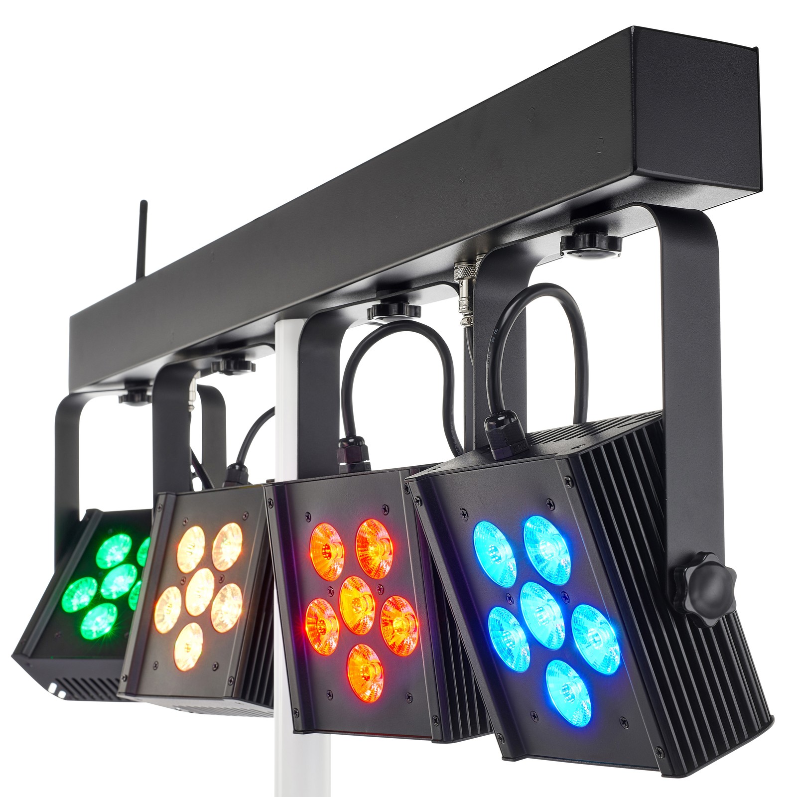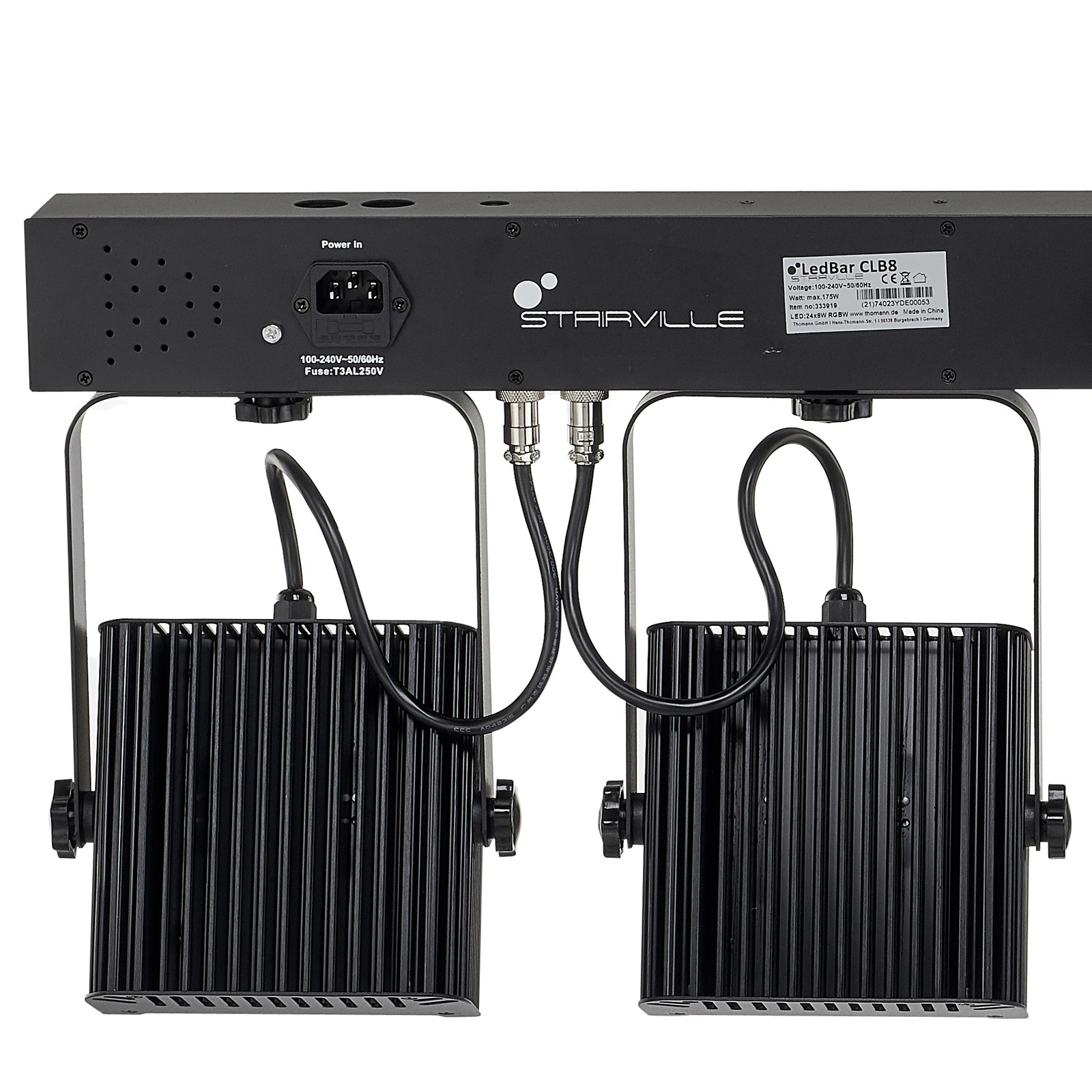 Das Stairville CLB8 Compact LED Bar 8 Bundle bietet vier leistungsstarke Scheinwerfer, die fertig an einer Bar befestigt und verkabelt sind. Insgesamt sind 24 RGBW-LEDs zu je 8 Watt verbaut. Sie strahlen in einem relativ breiten Abstrahlwinkel von 40°. Der Funkfußschalter hat vier große Taster. Strom erhält er über das mitgelieferte Netzgerät. Er funkt zwischen 2,4 und 2,5 GHz. Mit Tasten und Display an der Bar oder per DMX im 2-, 4- oder 18-Kanal-Modus sind pro Scheinwerfer Rot, Grün, Blau und Weiß einzeln ansteuer- und mischbar. Außerdem wird ein Stroboskopeffekt geboten. Darüber hinaus lassen sich 21 automatische Lauflichter, die Musiksteuerung und der Master-Slave-Modus aktivieren. Die Bar hat einen 36-mm-Flansch, um sie auf das mitgelieferte Lichtstativ zu stellen.