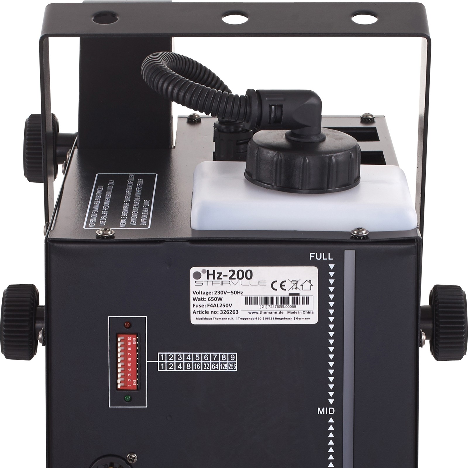 Das Stairville Hz-200 Compact Hazer DMX Bundle bietet praktisch unsichtbaren Dunst, in dem Lichteffekte besser zur Geltung kommen. Das Heizelement hat eine Leistung von 615 Watt. Schon nach etwa eineinhalb Minuten ist das Gerät einsatzbereit. Ein Hazer erschafft einen Effekt, dessen Wirkung sich erst nach und nach aufbaut, nachdem sich das zerstäubte Fluid in der Raumluft verteilt hat. Der Dunsterzeuger wiegt 7,5 kg und misst einschließlich Einfüllstutzen und Bügel 280 x 330 x 380 mm. Der Tank fasst 1,2 Liter Flüssigkeit. Fünf Liter eines geeigneten Fluids sind bereits im Lieferumfang enthalten. Es bietet sehr gute Reflexionseigenschaften für Licht- und Lasershows. Der Stairville Hz200 Compact Hazer DMX kann per DMX, mit den DIP-Schaltern am Gerät oder mit der kabelgebundenen Fernbedienung angesteuert werden. Diese ist bereits im Lieferumfang enthalten. Die Stellung des zehnten DIP-Schalters ist dabei von Bedeutung. Nutzt man das Mäuseklavier, muss er auf ‚On‘ stehen, in den beiden anderen Betriebsarten auf ‚Off‘.
