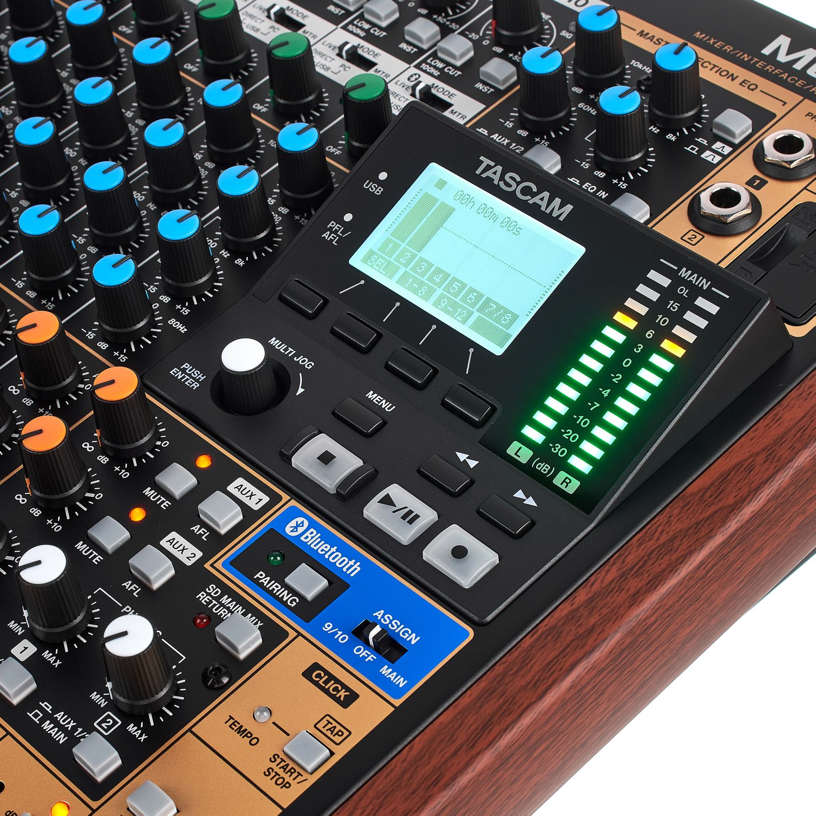 Das Tascam Model 12 ist ein echtes Multitalent: Hier trifft analoges Mischpult-Feeling auf digitale Funktionsvielfalt und vereint sich zu einem echten Audio-Alleskönner. Das Model 12 kann als Kompaktmischpult genutzt werden, verfügt über einen Stand-alone-Mehrspurrekorder, arbeitet als USB-Audio-Interface und kann im Homestudio gleichzeitig auch als Fernsteuerung für die DAW-Software dienen. Das Model 12 besitzt acht Ultra-HDDA-Preamps, die einen erstklassigen und rauscharmen Sound liefern. Das Model 12 begeistert dabei mit jeder Menge praktischer Features: mit dem TRRS-Eingang für Smartphones mit Mix-Minus-Funktion zum Beispiel oder mit dem separaten Ausgang für einen Metronom-Klick (das Tempo des Klicks kann über die „Tap-Tempo“-Taste eingegeben werden). Und egal, in welcher Situation man das Tascam Model 12 am Ende einsetzt, die Seitenwangen in Massivholzoptik lassen es dabei immer gut aussehen.