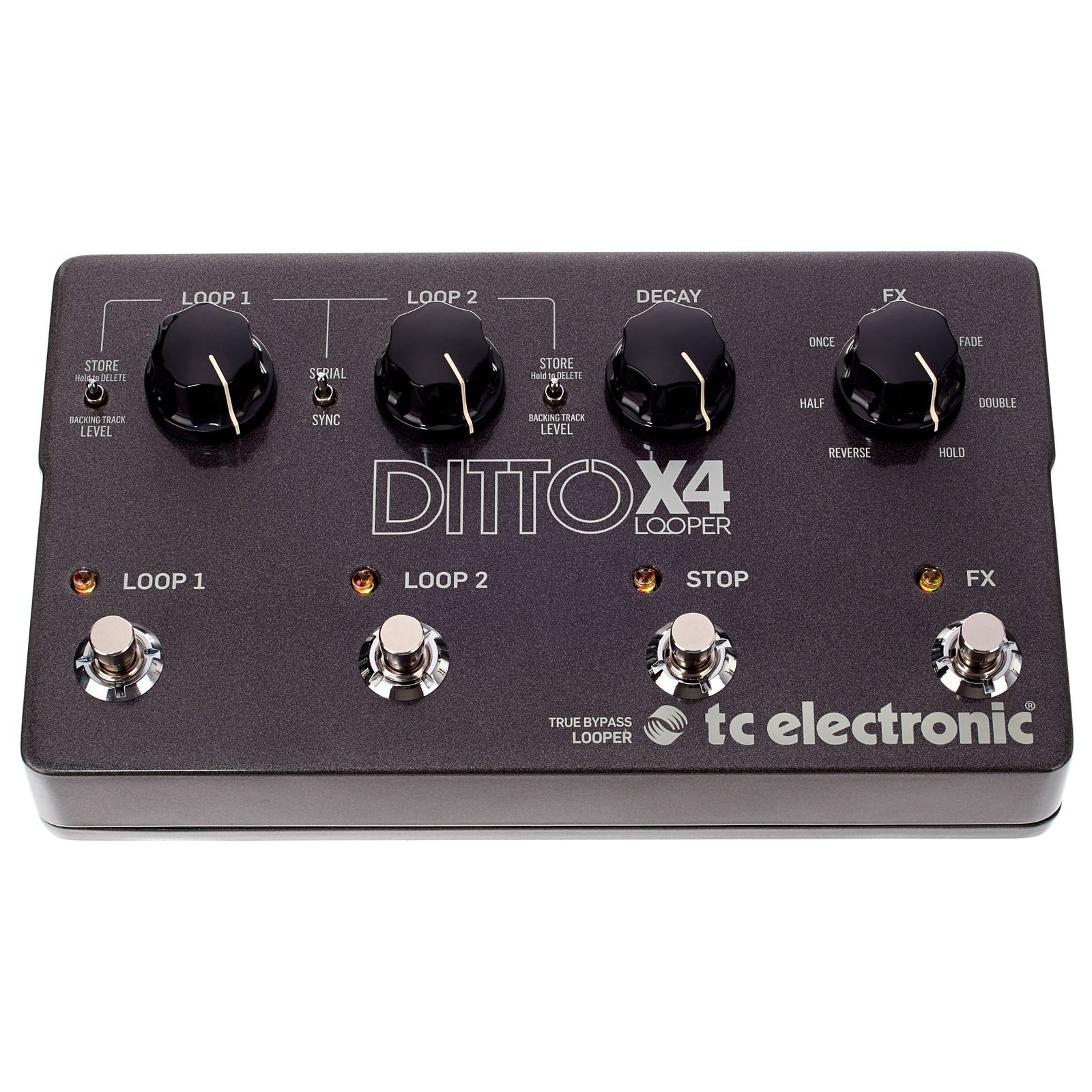 Das robuste Gehäuse des Ditto X4 besteht aus Metall und ist bestens für den harten Bühnenalltag geeignet. Eine unbegrenzte Anzahl an Loops mit insgesamt fünf Minuten Aufnahmezeit, und das bei unkomprimierter Soundqualität von 24 Bit Auflösung, sind die inneren Werte des X4. Dieser wurde im Vergleich zum X2 nicht nur im Format, sondern auch in der Funktionalität erweitert. Zwei Loops stehen nun zur Verfügung, die entweder einzeln verwendet oder über das Timing synchronisiert werden können. Zudem lassen sich mehrere inspirierende Effekte für das Abspielen des Loops wählen und per Fußschalter aktivieren. Die beiden linken Drehregler sind für die Lautstärke der bereits aufgenommen Loops zuständig, und mit den entsprechenden Fußschaltern steuert man bei beiden Loops sämtliche Funktionen wie Aufnahme, Wiedergabe, Stop, Start, Löschen, Undo, Redo. Per USB Anschluss kann man Dateien sowohl vom Ditto X4 exportieren, als auch auf ihn importieren (z. B. Star Jam Loops).
