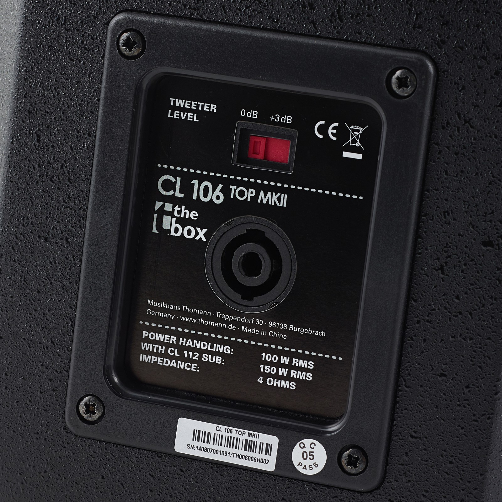 Eingangsseitig befindet sich auf der Rückseite der CL 106 eine verriegelbare Speaker-Twist-Einbaubuchse. Über diese können die Lautsprecher mit einer Belastbarkeit von 100 W (RMS) und einer Impedanz von 4 Ohm von einer Endstufe mit Leistung versorgt werden. Dafür kann sowohl ein Powermixer, eine einzelne 19“-Endstufe oder die Zusatzendstufe zur Versorgung von Satellitenlautsprechern eines aktiven Subwoofers zum Einsatz kommen. Bei Bedarf lässt sich mit einem Schalter am Anschlussfeld auf der Rückseite der Pegel des Kompressionstreibers um 3 dB anheben und sorgt so für eine Höhenanhebung ab 5 kHz. Damit können bereits an der Box zwei unterschiedliche Klangcharaktere gewählt werden.