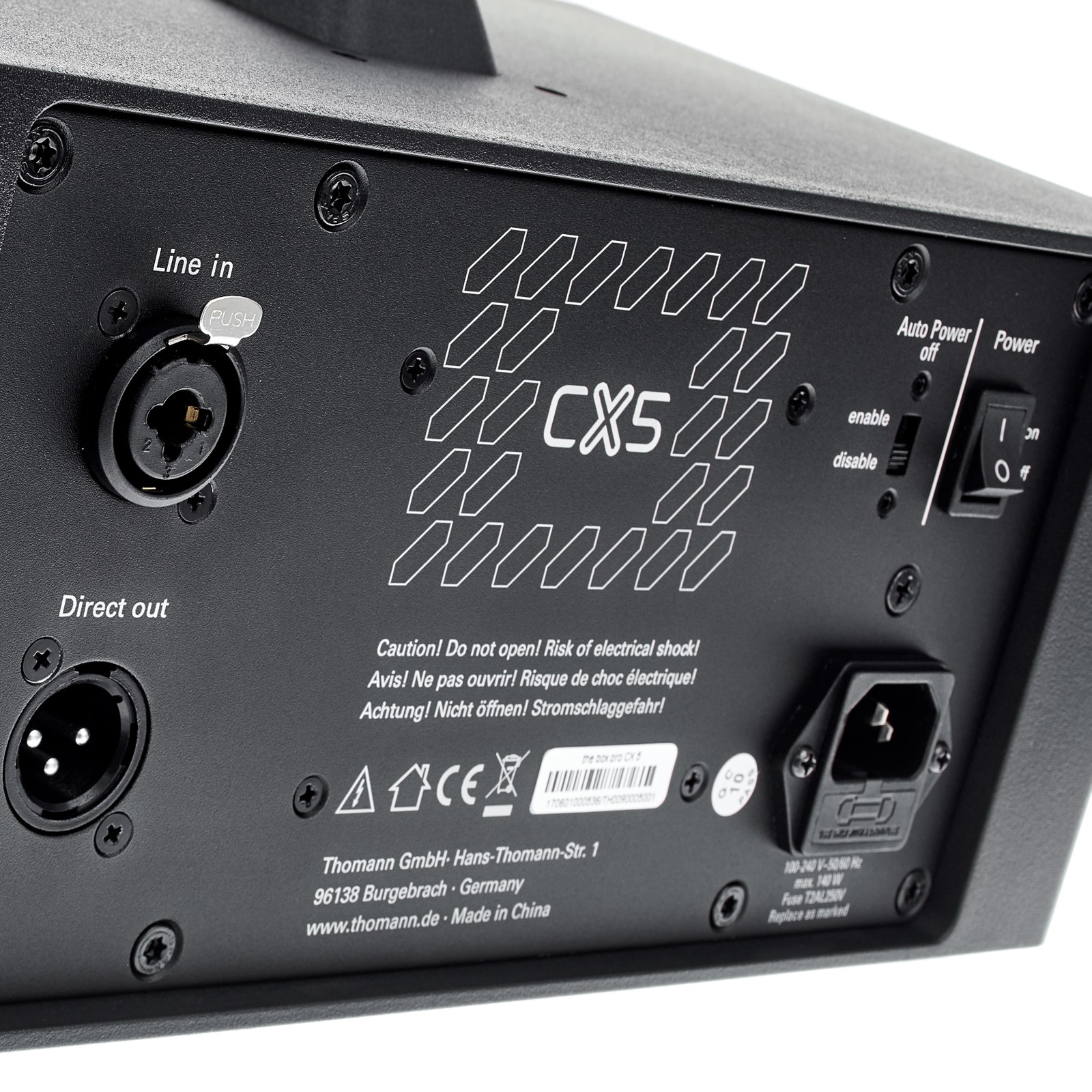 Der the box pro CX5 ist ein kompakter Monitor mit integrierter 180-Watt-Class-D-Endstufe. Das schwarze Kunststoffgehäuse verfügt über einen praktischen Tragegriff und eine 3/8“-Stativhalterung, mit der sich der CX5 an dem im Bundle mitgelieferten Mikrofonständer montieren lässt, wobei auch der nötige Gewindebolzen dabei ist. Der verbaute 5.25“-Koaxialtreiber operiert im Frequenzbereich von 70 Hz bis 20 kHz und wird über ein versenkt angebrachtes Mixermodul verwaltet. Die globale Klangregelung besteht aus drei Potis mit Festfrequenzen (Bass, Mid, Treble) und erlaubt schnelle Klangkorrekturen von Hand. Eingangsseitig warten zwei Monoeingänge und ein Stereoeingang auf Kontaktaufnahme. Für den Dauerbetrieb wurde dem CX5 eine abschaltbare Auto-Power-Funktion verpasst, wodurch die Box keinen unnötigen Strom verbraucht.