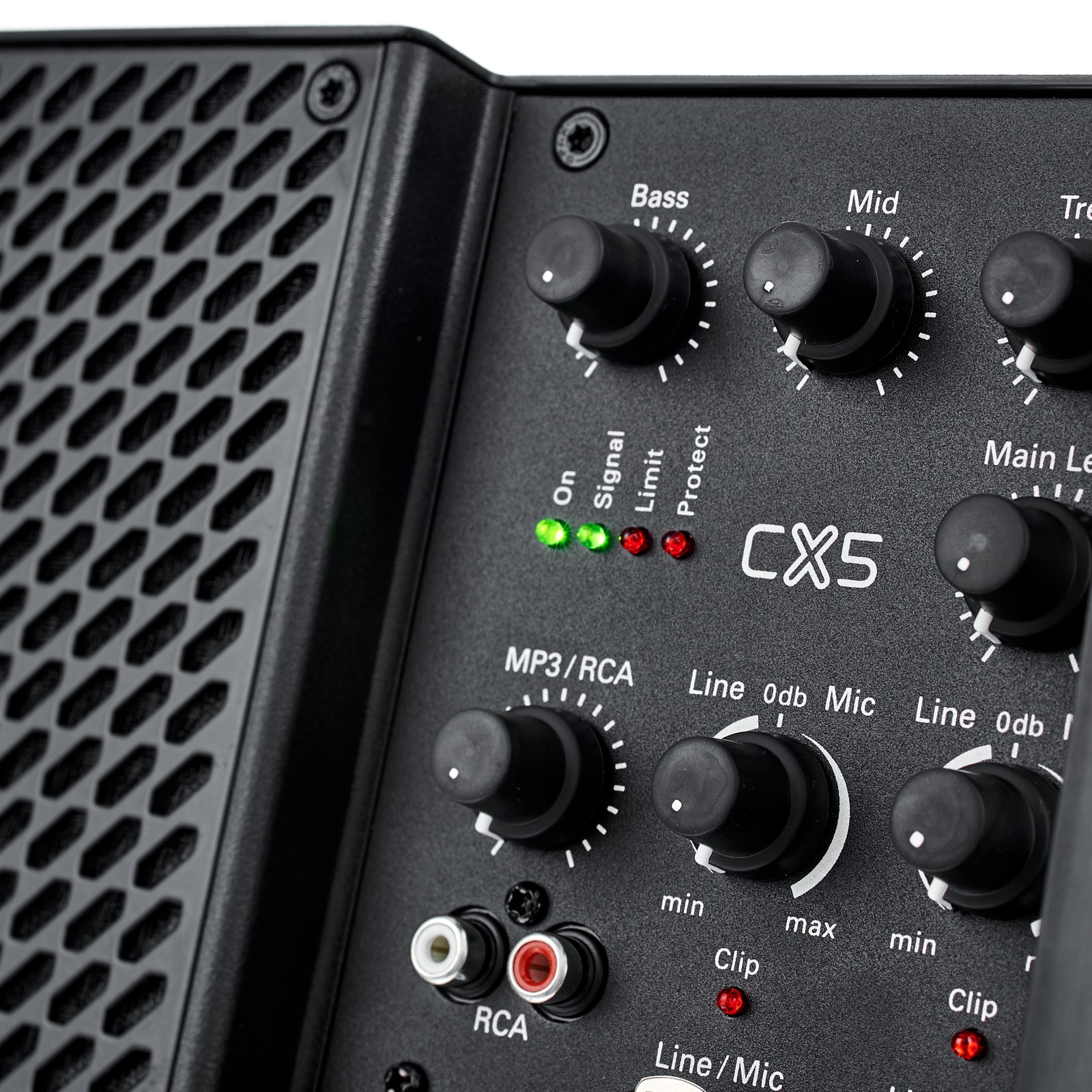 Der CX5 findet immer einen Platz im Handgepäck und ist damit quasi uneingeschränkt reisefähig. Für eine unkomplizierte Signalverstärkung benötigt der Minimonitor nur einen Stromanschluss und entsprechenden Input. Erstaunlichen Tiefgang und unbegrenzte Lautstärkereserven sollte man hingegen nicht unbedingt erwarten. Der CX5 ist allerdings potent genug, um als Monitor für moderat spielende Bands dienen zu können. Es handelt sich also eher um einen handlichen Helfer für den Proberaum und kleinere Bühnen, der zudem verschiedene Optionen bezüglich seiner Aufstellung bietet. Der CX5 dockt bei Bedarf am Standrohr eines Mikrofonstativs an und lässt sich dabei flexibel in der Höhe justieren. Alternativ können Anwender den CX5 über das integrierte Reduziergewinde auf einem Mikrofonstativ montieren und ihn ohne großen Aufwand auf die passende Höhe bringen.