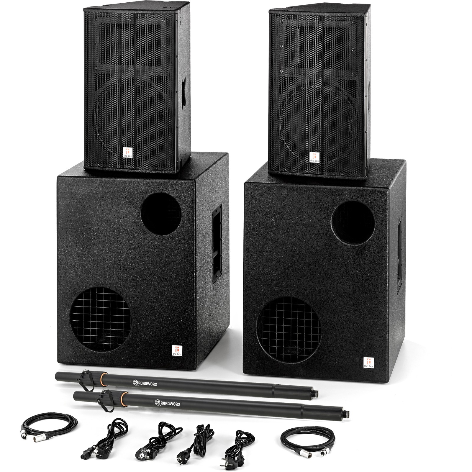 Das the box TA Power Bundle kann Proberäume, Feste und kleine Clubs beschallen. Es besteht aus zwei aktiven Fullrange-Lautsprechern the box TA12, die einen 12"-Tieftöner und einen 1,4"-Hochtöner beherbergen, sowie zwei aktiven Subwoofern the box TA18, die auf eine 18"-Membran setzen. Der maximale Schalldruck der TA12 beträgt 120 dB SPL, bei einer Ausgangsleistung von 300 W im Bass- und 100 W im Höhenbereich. Die interne Endstufe der Basslautsprecher liefert 500 W RMS und bis zu 131 dB SPL. Der Frequenzgang der Bassboxen reicht hinab bis 35 Hz, der Übertragungsbereich der Top-Lautsprecher erreicht maximal 16 kHz. Damit deckt diese Kombination die wichtigsten Frequenzbereiche ab. Außerdem sind zwei Roadworx Multi Pole Distanzstangen dabei, die sich bis auf 1,36 m Länge ausziehen lassen. Um das Lautsprecherset mit Sound zu versorgen, sind auch noch zwei 3 m lange Cordial-Mikrofonkabel mit Neutrik-Steckern am Start.
