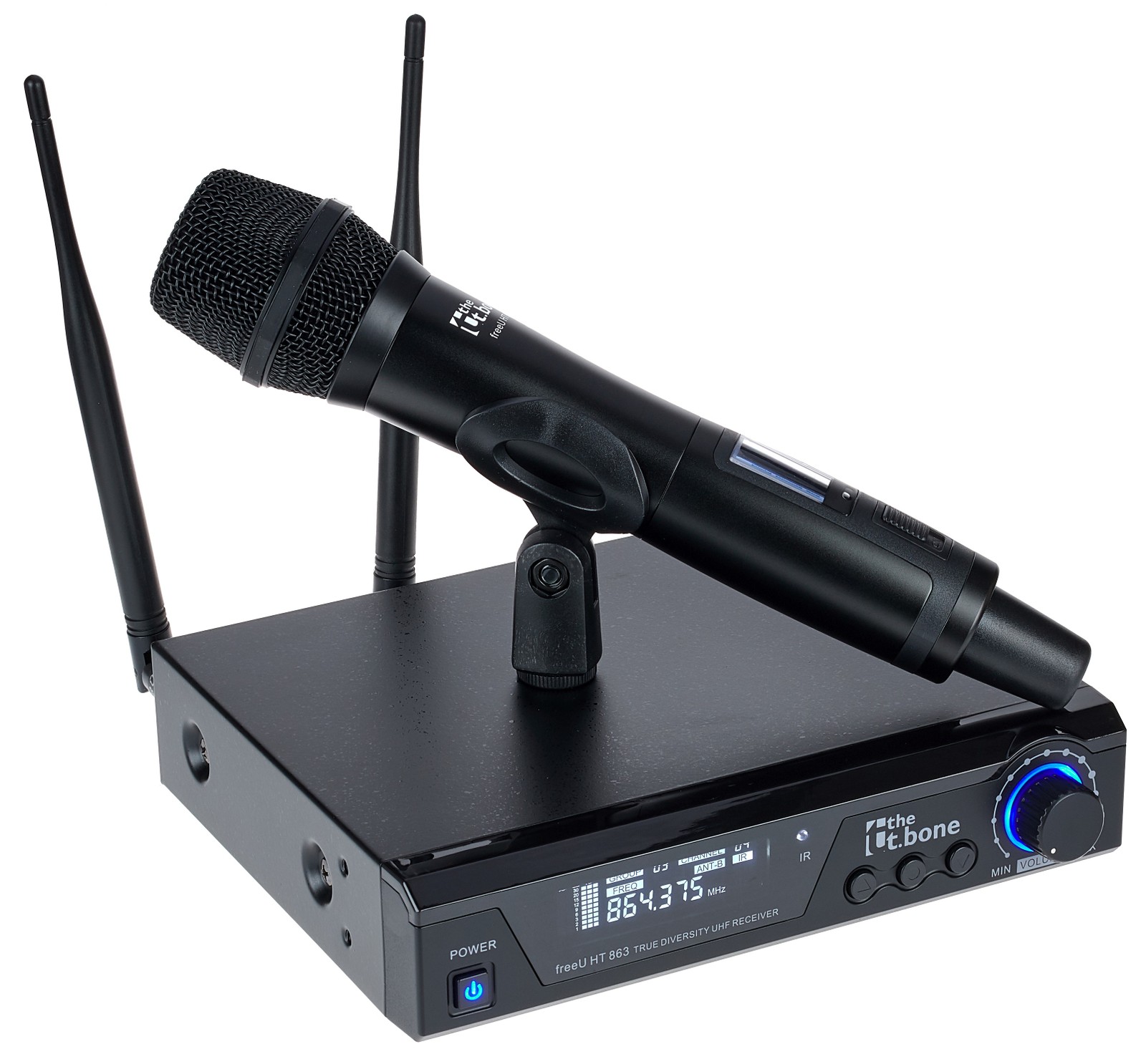 Das the t.bone freeU HT 863 beweist, dass Drahtlosanlagen heute auch für wenig Geld tolle Specs bieten können. Das dynamische Mikrofon ist mit seinem Metallschaft robust und bühnentauglich, sein Display verhilft dem Anwender zu einem optimalen Überblick, und die Mikrofonkapsel greift mit ihrer Supernieren-Charakteristik nur wenig seitlich einfallenden Schall auf. Das alles macht die Handhabung des Funkmikrofons auf der Bühne auch für Einsteiger kinderleicht. Noch dazu findet das the t.bone freeU HT 863-Set freie Funkfrequenzen selbsttätig per automatischem Scan. Bei schwachem Funksignal verhindert ein Auto-Squelch, dass der Receiver aufrauscht.