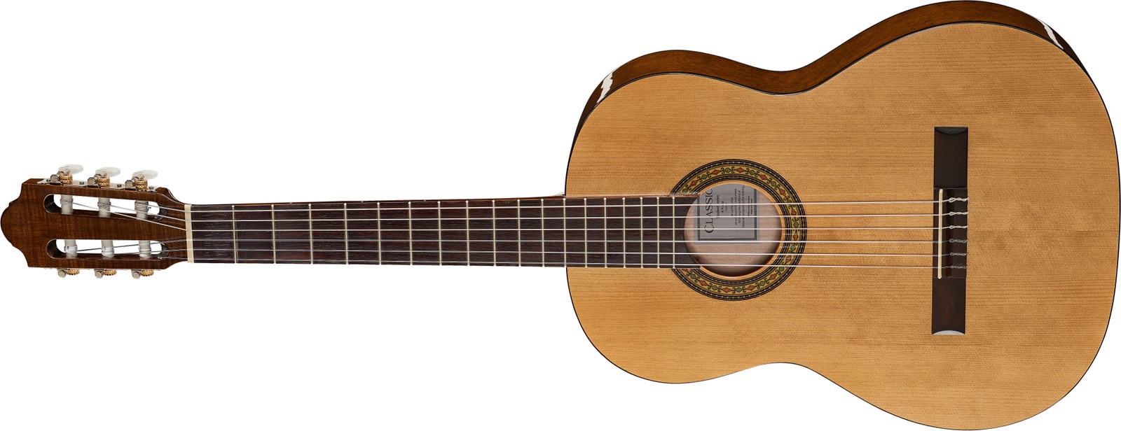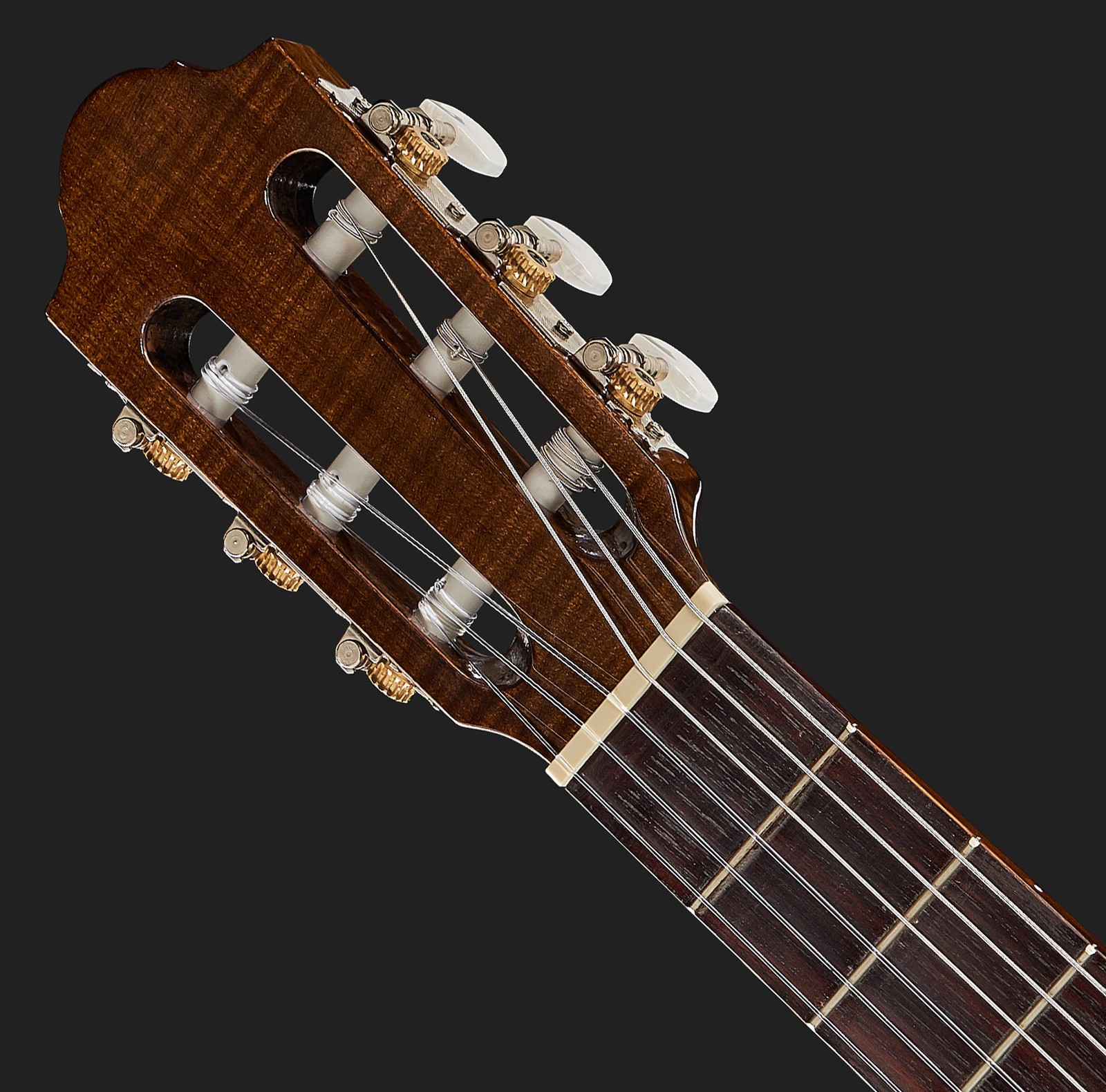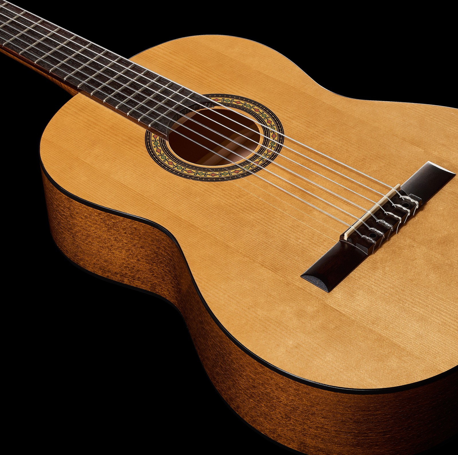 Die Thomann Classic 4/4 left ist eine Gitarre, die sich genau an die bewährte Vorlage hält. Der Korpus dieses in Europa gebauten Instruments besteht aus laminierter Buche, die Decke aus laminierter und getönter Fichte. Für den Hals wird Ahorn verbaut. Auch das Griffbrett ist mit 52 Millimetern so breit wie das einer normalen Klassikgitarre. Die Mensur beträgt 65 Zentimeter. Vom Aufbau her ist sie somit eine typische Konzertgitarre. Bauarttypisch kommt diese Gitarre ohne Gurtpins und ist somit für ein Spielen im Sitzen ausgelegt. Auch sind mit einer Tasche mit Rucksackgurten, einem Stimmgerät und der höhenverstellbaren Fußbank drei wichtige Zubehörteile dabei.