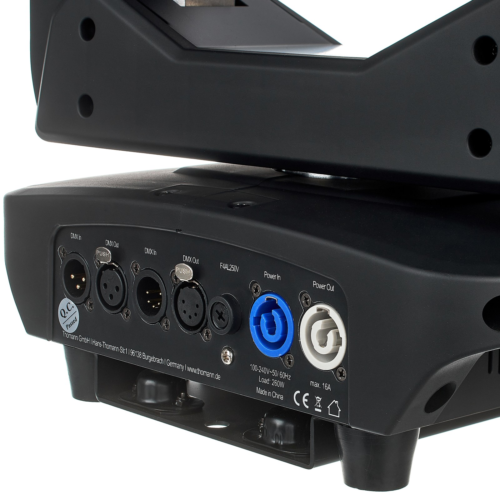 Wer auf Tour wenig Equipment einsetzen möchte, aber dennoch seine Moving-Lights statt am Boden lieber in der Luft sieht, greift zu den beiden mitgelieferten Omega-Brackets zwecks schneller Montage an Traversen. Selbst wenn man für eine gleichmäßige Beleuchtung der Szenenfläche zwei Scheinwerfer nutzt, ist ein Lichtpult nicht erforderlich. Der erste Scheinwerfer wird zum Master. Den zweiten versetzt man in den Slave-Modus, wählt bei ihm die DMX-Steuerung und schließt ihn mit einem DMX-Kabel wie dem Stairville PDC3CC DMX Cable 10,0 m 3 pin an den ersten an. In den Output des Slave steckt man noch als Abschlusswiderstand den Stairville DMX Endstecker XLR 3-pol.. Schon agieren beide synchron.