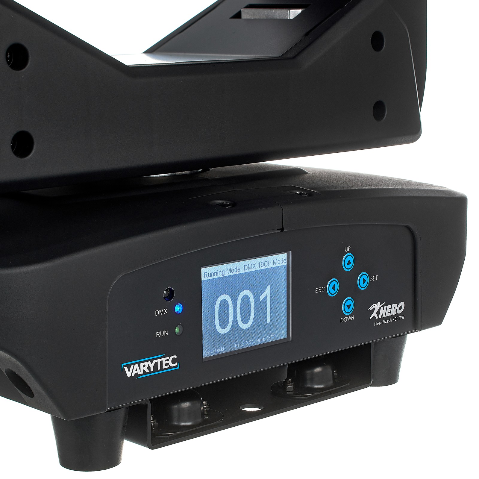 Spiel- und Szenenflächen bis zu einer mittleren Größe erhellt der Varytec Hero Wash 300 TW flächig in Weiß. Wer ihn in kleineren Locations oder an Messeständen in Reichweite des Publikums aufstellt, kann mit der Autolock-Funktion sicherheitshalber die Tastensperre aktivieren. Damit bei Theateraufführungen die künstlerische Darbietung und nicht die Technik auffällt, lässt sich die Displaybeleuchtung so einstellen, dass sie nach einigen Sekunden ohne Eingabe automatisch erlischt. Für unmerkliche Szenenübergänge ermöglicht die Blackout-if-XY-run-Funktion eine Dunkelschaltung während Pan- und Tiltbewegungen. Bei Bedarf kann dieser Scheinwerfer ganz schön leise an den Start gehen. Wer zum Beispiel für Lesungen in gedimmtem Licht nicht die maximale Leistung abruft, erlebt im Silentmodus den Lüfter angenehm zurückhaltend.