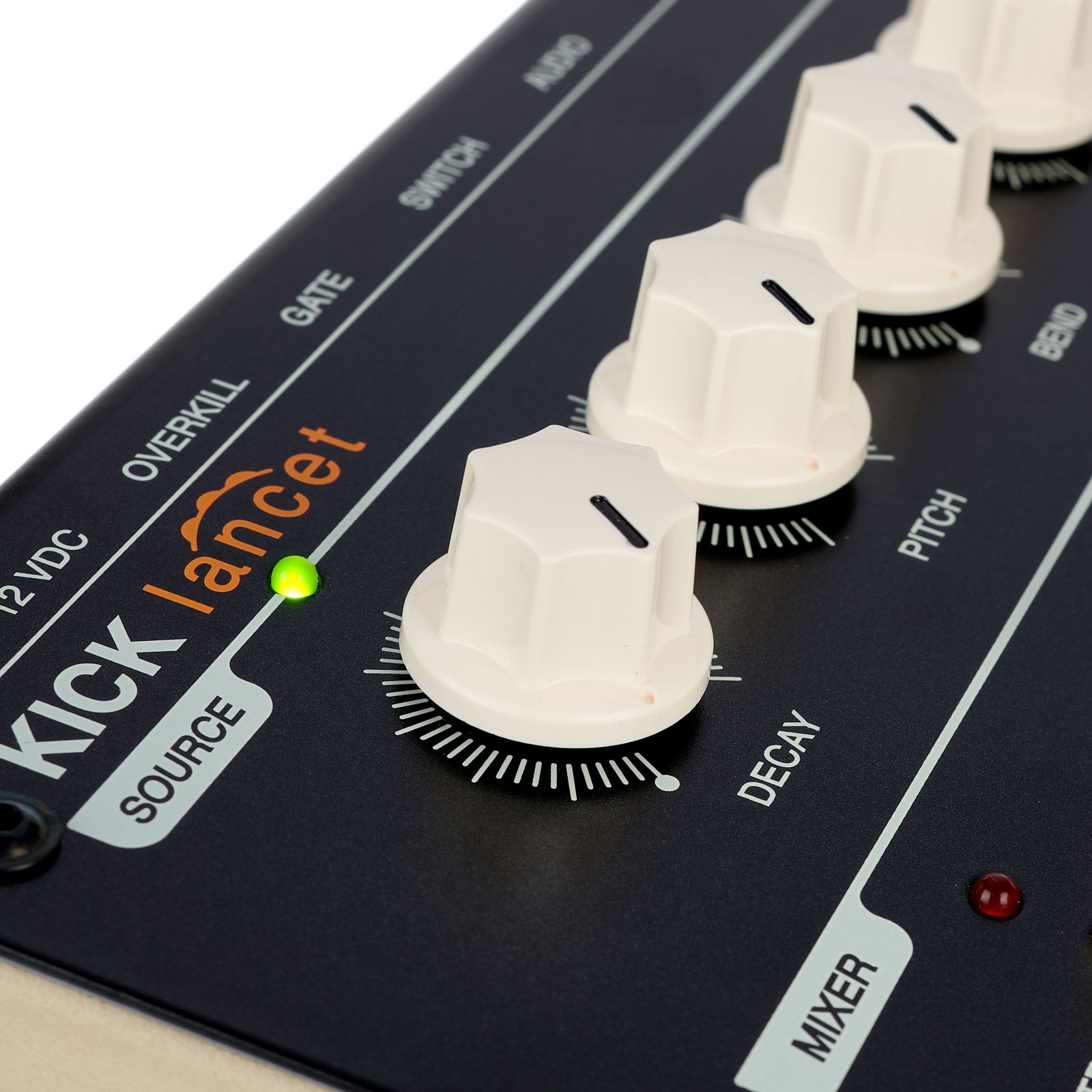 Kick Lancet erzeugt Bassdrums über einen analogen Oszillator. Der Sound kann von einer sinusähnlichen Wellenform bis zu einem harsch klingenden Rechteck variiert werden. Die Attackphase wird mit Impuls und Noise definiert, während sich über die Pitchbend-Hüllkurve typische Dance-Kicks im Stil der TR-909 erzielen lassen. Der LFO, der bis in den Audiobereich beschleunigt werden kann, moduliert den Sound vom langsamen Pulsieren bis hin zu FM-Drums. Mit dem integrierten EQ kann der Bassbereich anschließend noch weiter nach vorne gebracht werden. Die Bassdrum wird mit einer frei zuweisbaren MIDI-Note, dynamischen Gate-Impulsen, Audiosignalen oder einem angeschlossenen Fußschalter getriggert.