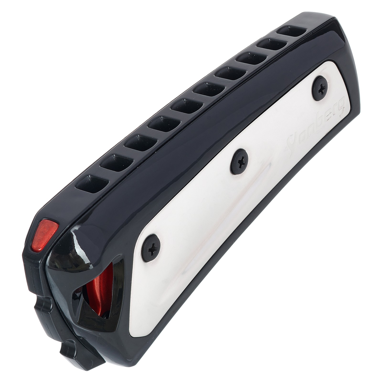 Die Yonberg D2 Storm Black ist eine zehnkanzellige, diatonische Harp in Richter-Stimmung – also das, was die Blueser und Rocker fast ausschließlich benutzen. Allerdings unterscheidet sie sich dann doch in einigen Punkten von der Konkurrenz. Speziell die Stimmzungengeometrie ist eine sehr eigene; Yonberg nennt sie „Gamma“, nach dem griechischen Buchstaben γ. Die Zungen sind an der Basis deutlich breiter als an der Spitze. Zusammen mit dem Material, nämlich Edelstahl, sorgt das für eine erhöhte Stabilität und längere Haltbarkeit. Der Kanzellenkörper sowie Teile der Abdeckung bestehen aus dem lebensmittelechten Epoxydharz Tritan, wobei der Abstand der Kanzellen etwas größer ist als bei dem schwäbischen Mitbewerber. Sehr praktisch ist die Wartungsfreundlichkeit der Instrumente: Mit nur drei Schrauben ist die Storm Black sicher und vor allem luftdicht verschraubt.