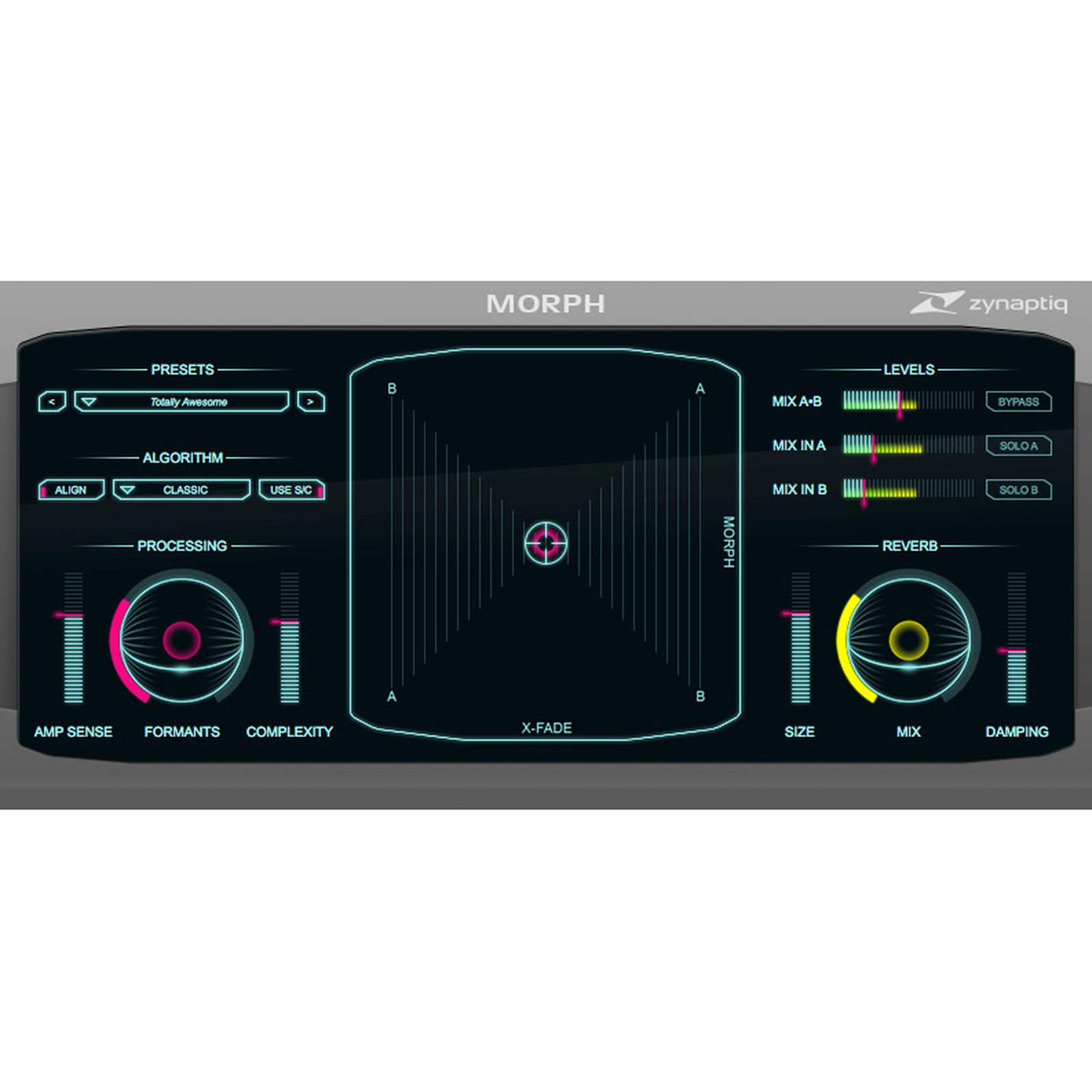 Jeder der Effekte aus dem Zynaptiq Design Bundle bietet die Möglichkeit, Sounds auf eine eigenständige Art bis ins Extrem zu verformen. So kommt Morph 2 mit fünf Algorithmen, um beispielsweise den Klang eines beliebigen tonalen Instruments mit Alltagsgeräuschen zu verschmelzen. Wormhole nutzt eine Kombination aus einem neuartigen Warp-Effekt, einem Pitch-/Frequency-Shifter und einem dualen Reverb und erzeugt z.B. stark verfremdete Stimmen oder wabernde Effektwolken. Der Hall aus Adaptiverb wirkt dagegen in vielen Fällen wie ein Hybrid aus Reverb und einem gelayerten Synth-Pad und schafft außergewöhnliche Texturen, die einem Signal Größe verleihen, ohne es im Mix deutlich in den Vordergrund zu rücken.