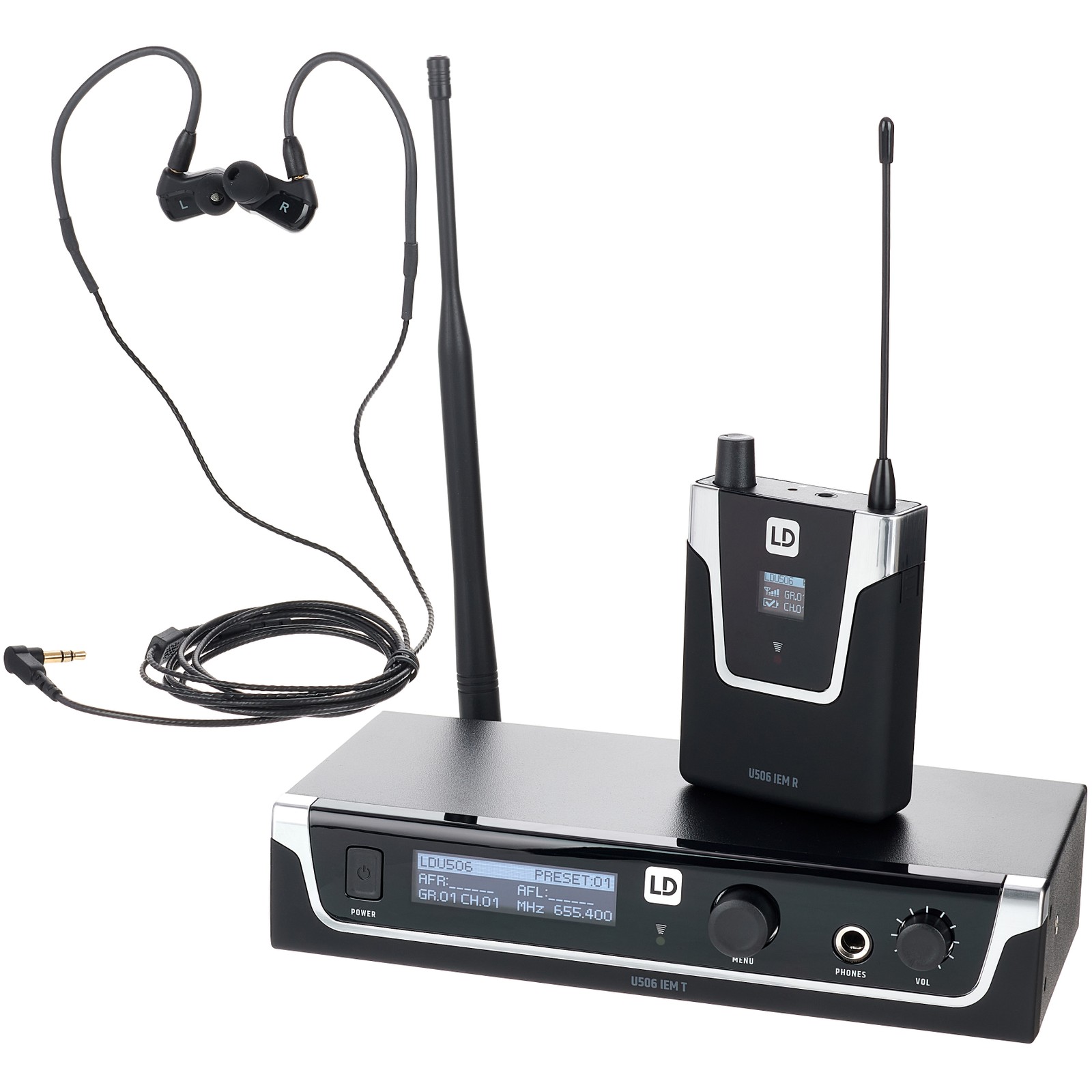The LD Systems U506 IEM HP is a wireless in-ear monitoring system that comprises a stationary transmitter, a pocket receiver, and an in-ear headset. This system allows wireless transmissions to be made over distances of up to 100 metres, and it comes at a budget-friendly price. It delivers a good price-performance ratio by combining affordability with professional features such as infrared synchronisation and adjustable noise limiting (squelch), and the transmitter is of course equipped with balanced XLR/jack combo sockets. In addition to the bright OLED displays on both the body pack and the receiver, another attractive feature is that the bundle also includes a rack kit and transport case – accessories that are unusual for wireless systems at the “budget” price point.